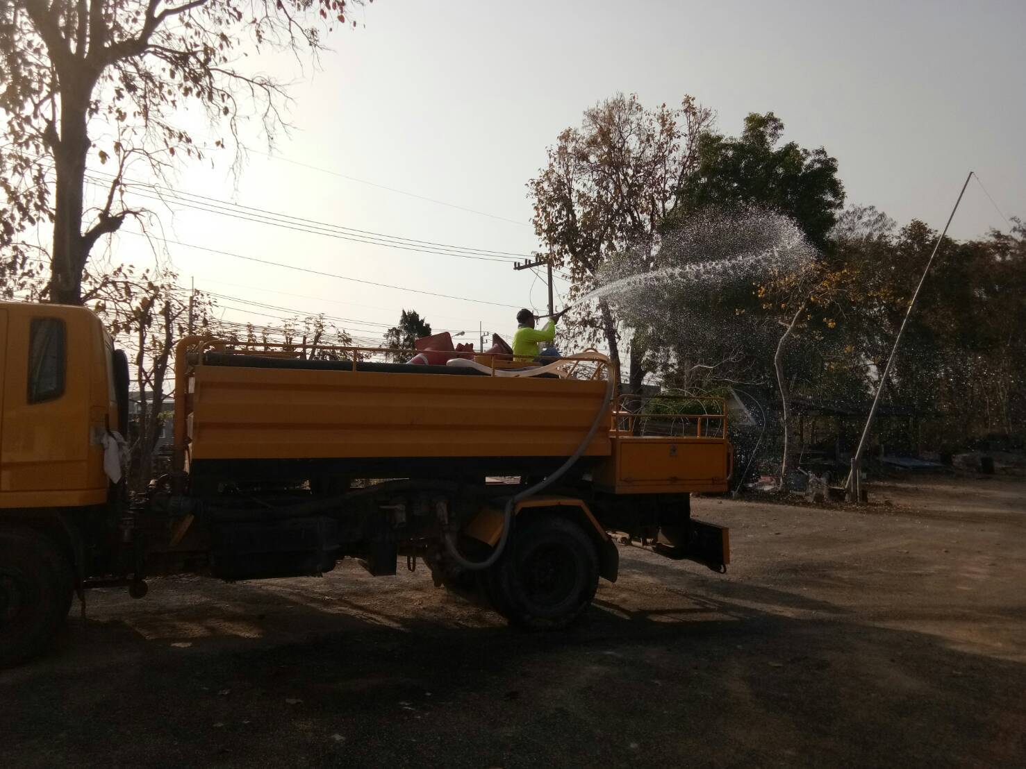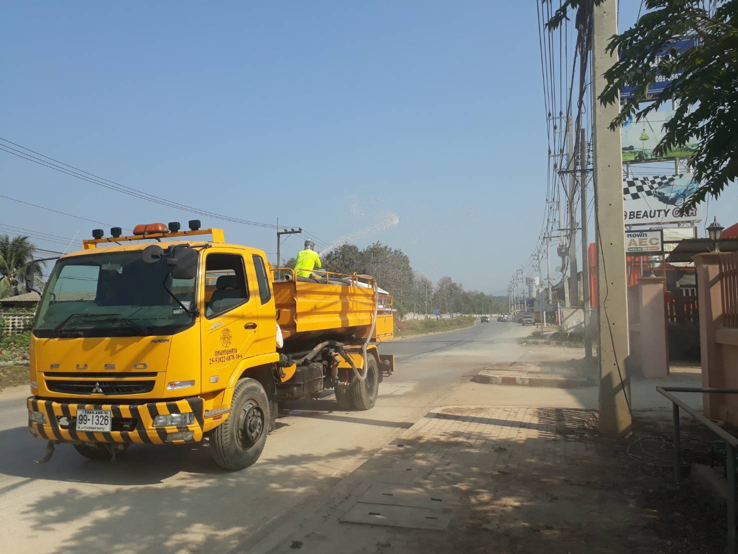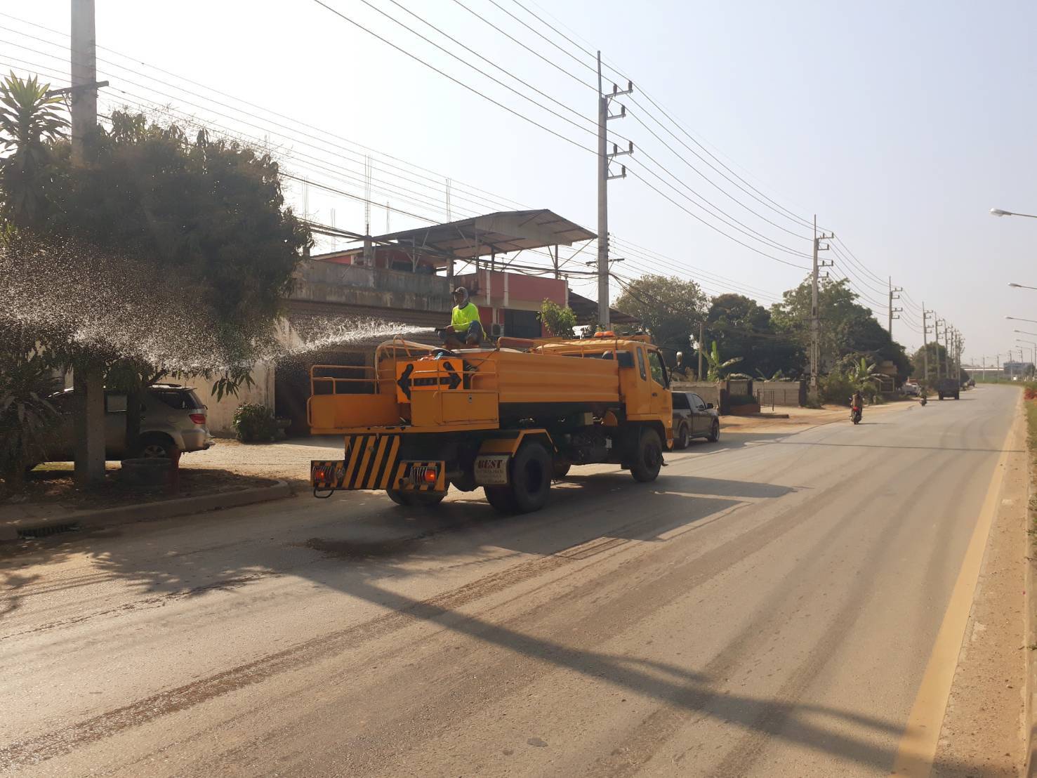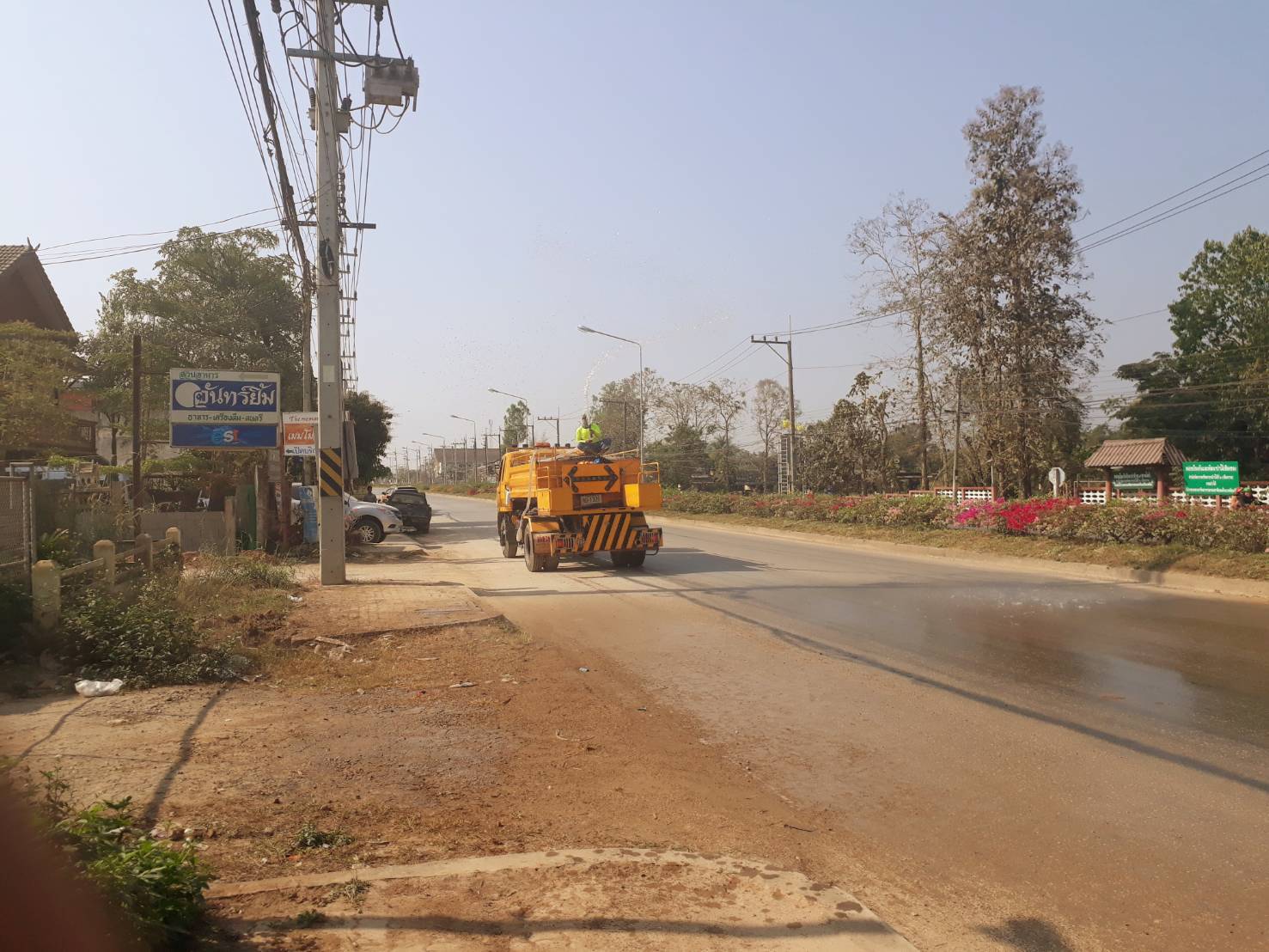 ดำเนินการทำความสะอาดถนน และฉีดพรมน้ำเพื่อ ลดฝุ่นละออง PM 2.5