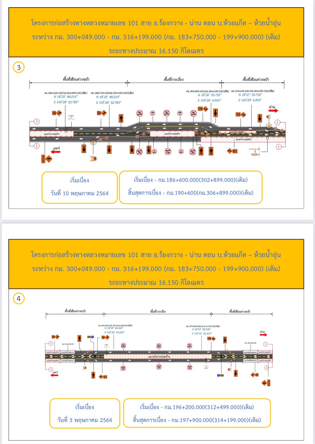 แขวงทางหลวงน่านที่ 1 โดยโครงการก่อสร้างทางหลวงหมายเลข 101 สาย อ.ร่้องกวาง - น่าน ตอน บ.ห้วยแก๊ต - บ.ห้วยน้ำอุ่น ขอแจ้งการเบี่ยงการจราจรเพื่อการก่อสร้างเกาะกลาง ดังนี้