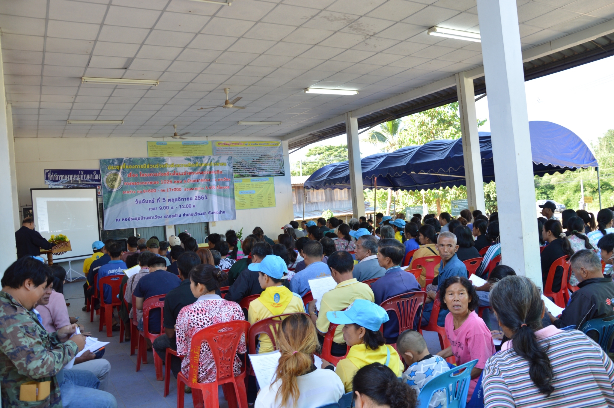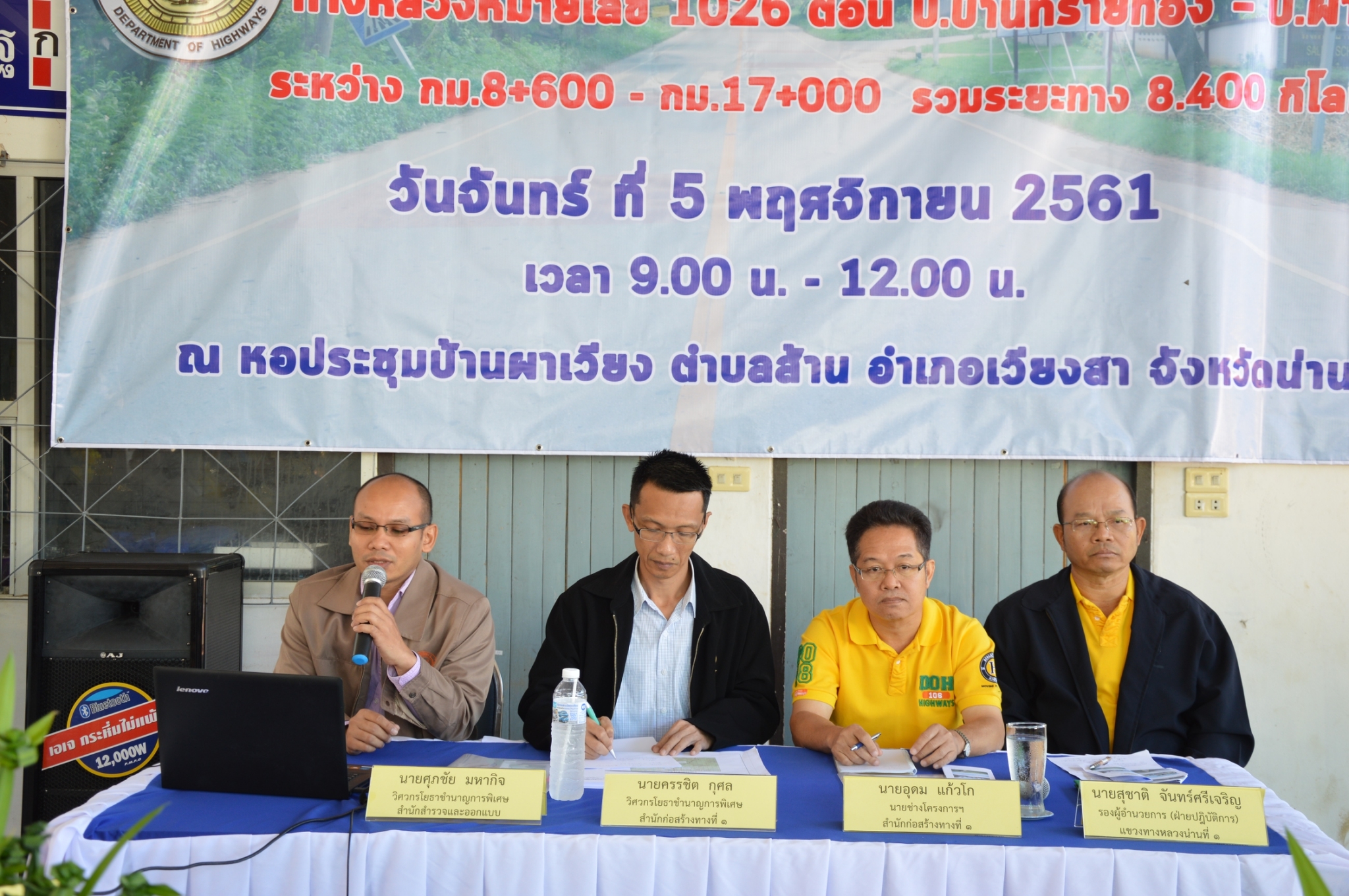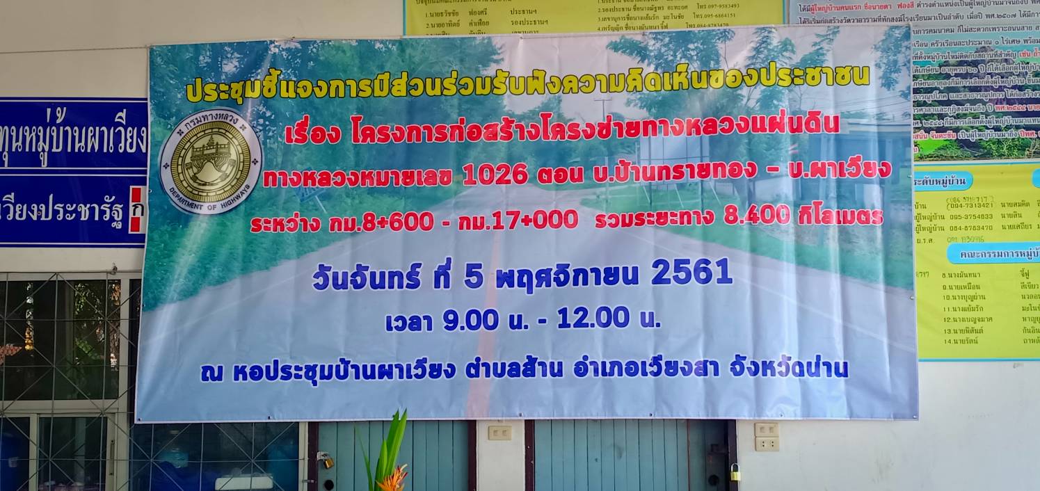 วันจันทร์ที่ 5 พฤศจิกายน 2561 เวลา 09.00 น.-12.00 น. นายสุชาติ จันทร์ศรีเจริญ รองผู้อำนวยการแขวงทางหลวงน่านที่ ๑(ฝ่ายปฏิบัติการ) กล่าวชี้แจงวัตถุประสงค์การจัดโครงการประชุมชี้แจงการมีส่วนร่วมรับฟังความคิดเห็นของประชาชน โครงการก่อสร้างโครงข่ายทางหลวงแผ่นดิน ทางหลวงหมายเลข 1026 สาย บ.ดอนไชย – บ.ผาเวียง ตอน ต.บ้านทรายทอง- บ.ผาเวียง ระหว่าง กม. 8+600 - กม. 17+000 รวมระยะทาง 8.400 กิโลเมตร โดยมีนายชัยณรงค์ คำชม กำนันตำบลส้าน อ.เวียงสา จ.น่าน เป็นประธานกล่าวเปิดการประชุม ณ หอประชุมบ้านผาเวียง ตำบลส้าน อำเภอเวียงสา จังหวัดน่าน มีผู้เข้าร่วมประชุมจำนวน 212 คน#มติที่ประชุม #เห็นชอบตามโครงการฯที่นำเสนอ