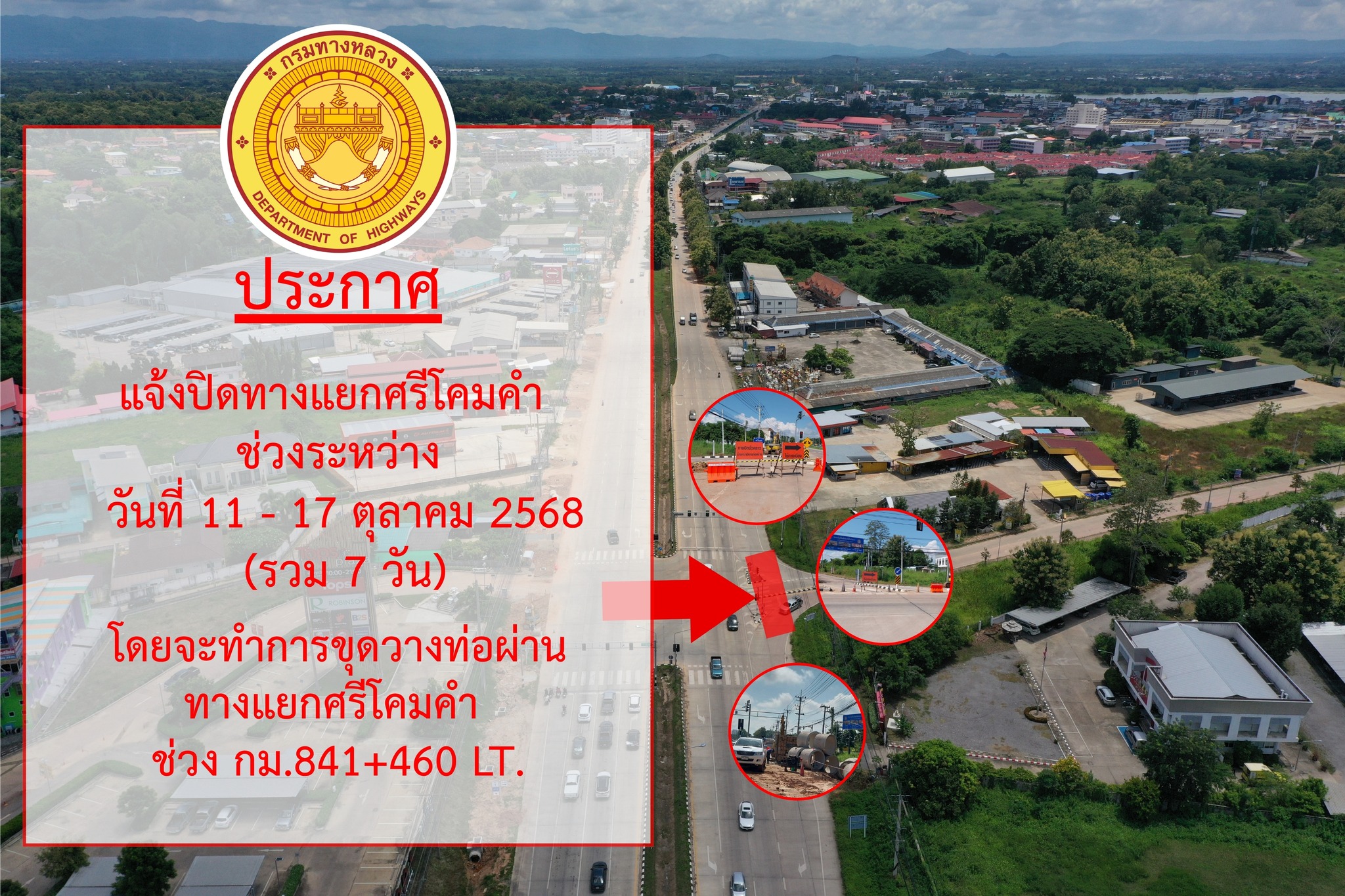 แจ้งปิดทางแยกป่าแดง ตอน แยกประตูชัย - พาน กม.840+350 (ด้านซ้ายทาง) ฝั่งถนนประตูกลอง ตั้งแต่วันที่ 26 ตุลาคม 2568 - 6 พฤศจิกายน 2568 (รวม 12 วัน)
