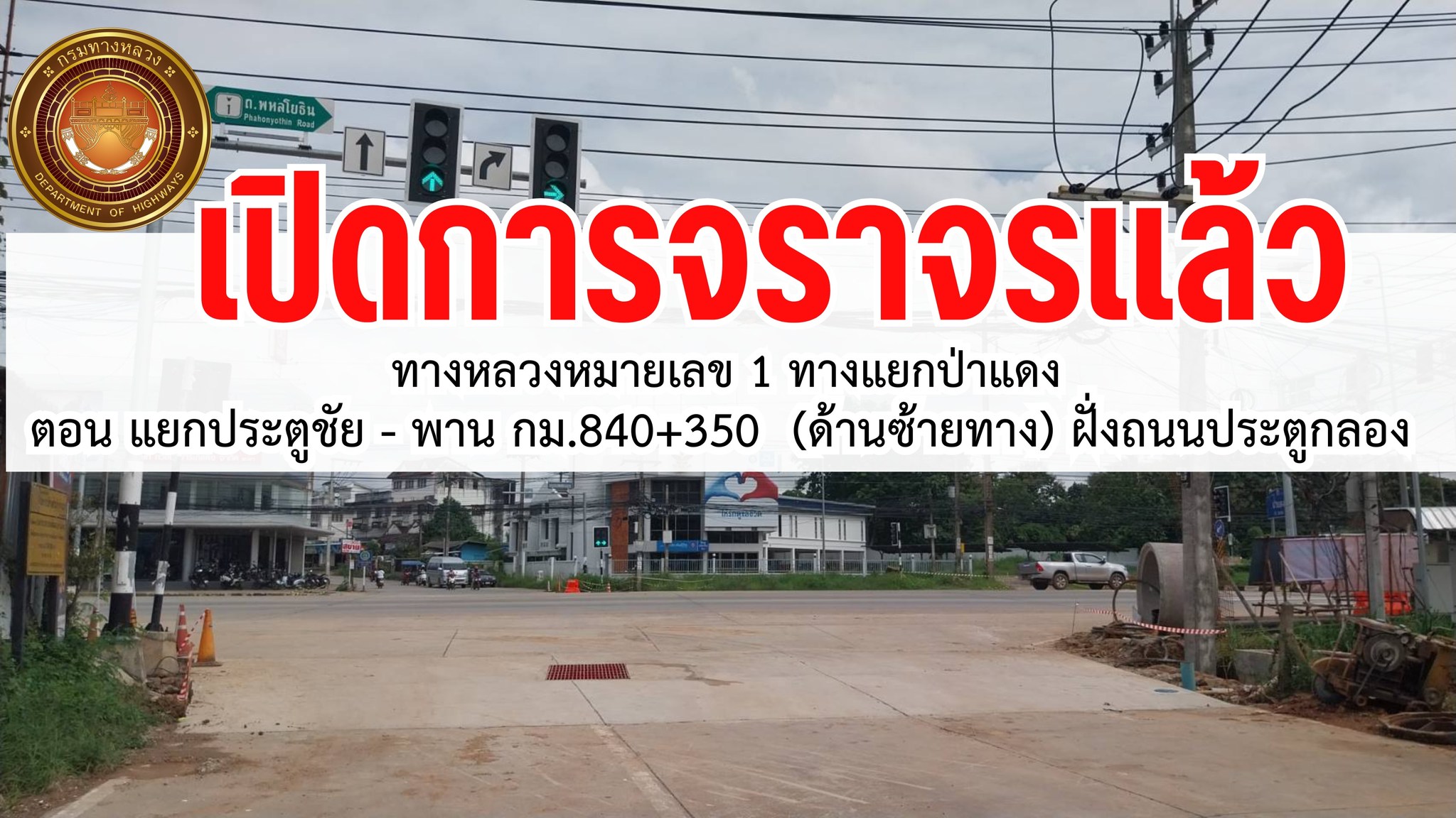 เปิดการจราจรแล้ว...ทางแยกป่าแดง ทางหลวงหมายเลข 1 ตอน แยกประตูชัย - พาน กม.840+350 (ด้านซ้ายทาง) ฝั่งถนนประตูกลอง