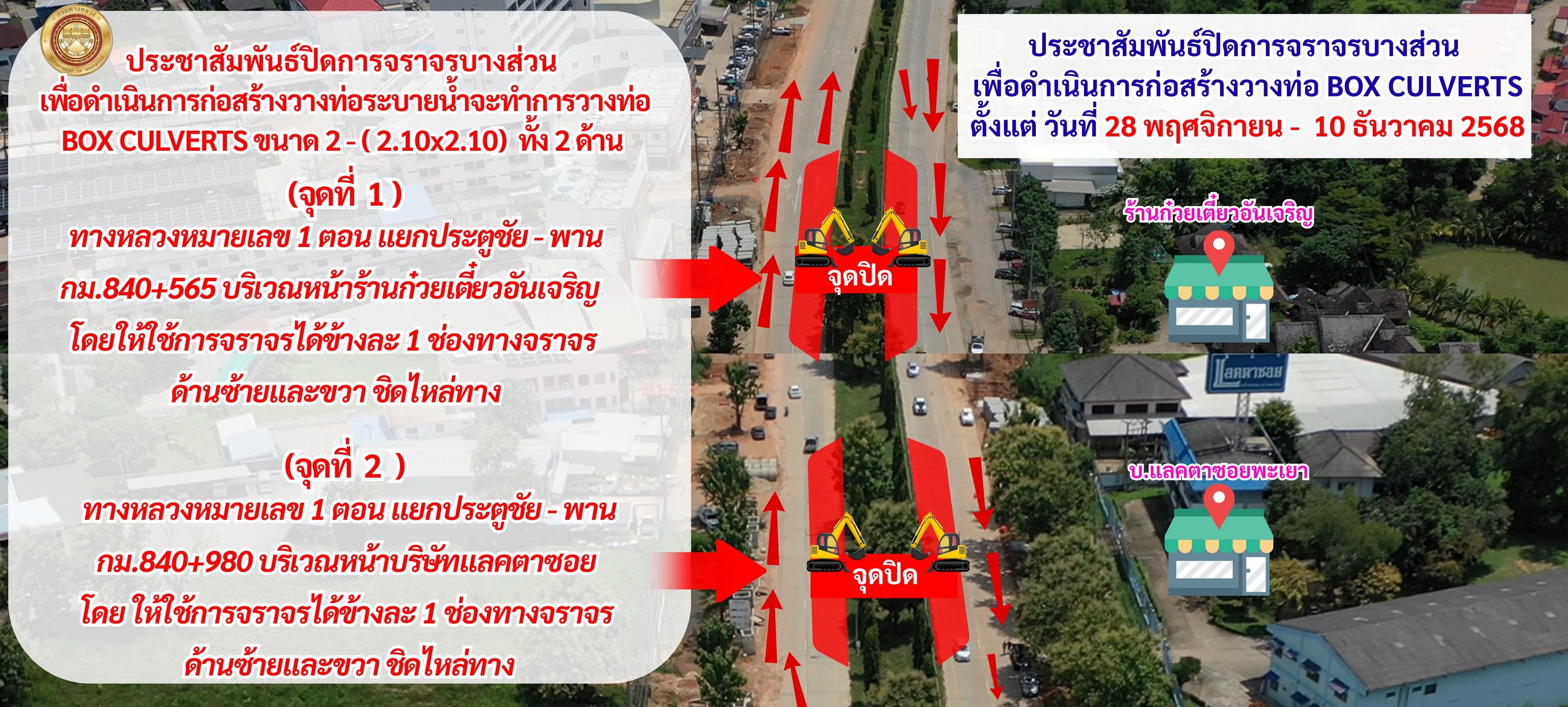 แจ้งปิดการจราจรบางส่วนในระหว่างดำเนินการก่อสร้าง เนื่องด้วยโครงการกิจกรรมแก้ปัญหาการระบายน้ำที่ส่งผลกระทบกับการจราจรบนโครงข่ายทางหลวง ทางหลวงหมายเลข 1 ตอนแยกประตูชัย - พาน ระหว่างกม.839+900 - กม.842+000 จะทำการปิดช่องจราจรเพื่อทำการก่อสร้างวางท่อระบายน้ำ คสล.(ใหม่) พร้อมทำโครงสร้างชั้นทางใหม่จนถึงผิวทางคอนกรีต ความหนา 25 cm. และเกาะกลาง (CURB AND GUTTER 0.50 M.WIDTH) ทดแทนผิวทางเดิมและเกาะกลางที่ขุดออกคืนสู่สภาพเดิม ช่วงกม.841+350 จำนวน 2 จุด