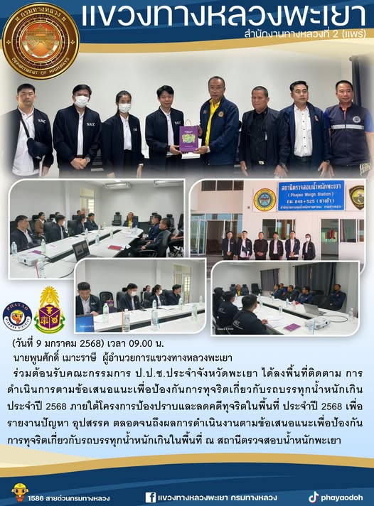 นายพูนศักดิ์ เมาะราษี ผู้อำนวยการแขวงทางหลวงพะเยา ร่วมต้อนรับคณะกรรมการ ป.ป.ช.ประจำจังหวัดพะเยา ได้ลงพื้นที่ติดตาม การดำเนินการตามข้อเสนอแนะเพื่อป้องกันการทุจริตเกี่ยวกับรถบรรทุกน้ำหนักเกิน ประจำปี 2568