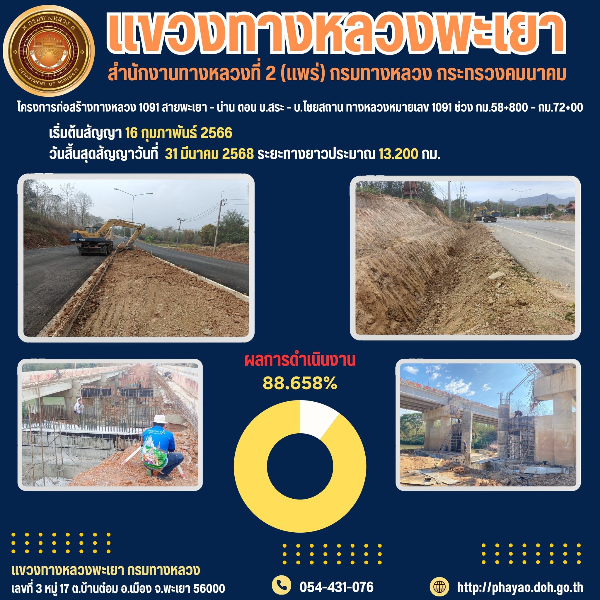 ความคืบหน้า เดือนกุมภาพันธ์ 2568 โครงการก่อสร้างทางหลวง 1091 สายพะเยา - น่าน ตอน บ.สระ - บ.ไชยสถาน ทางหลวงหมายเลข 1091 ช่วง กม.58+800 – กม.72+000