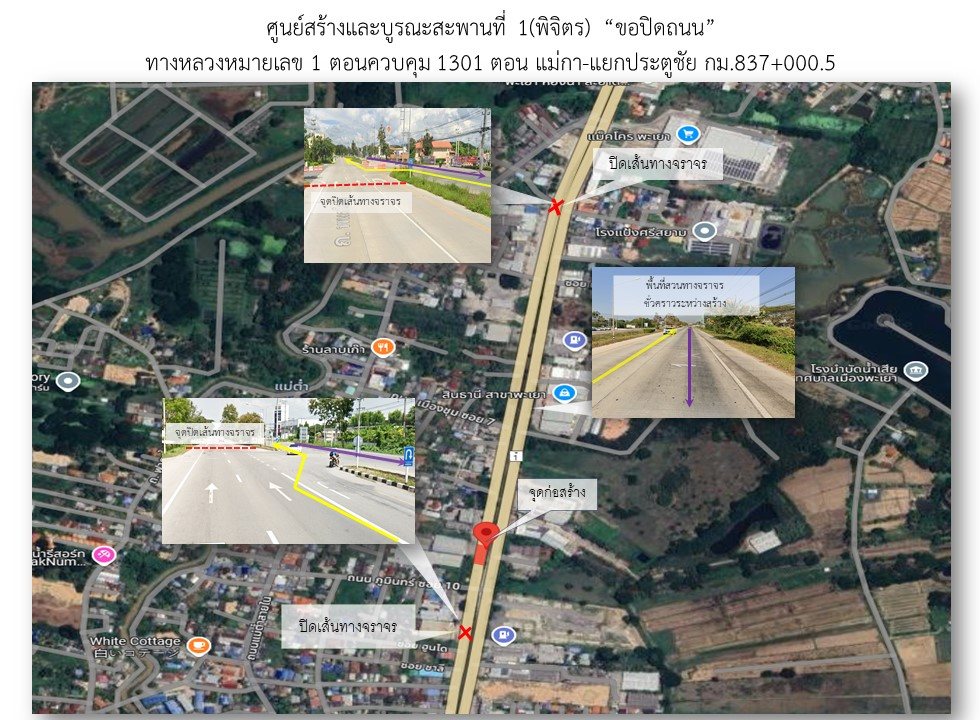 ข่าวประชาสัมพันธ์แขวงทางหลวงพะเยา ด้วยศูนย์สร้างและบูรณะสะพานที่ 1 (พิจิตร) จะดำเนินการก่อสร้างสะพาน คสล. บนทางหลวงหมายเลข 1 ตอน แม่กา - แยกประตูชัย ดำเนินการที่ กม.834+753.61 LT. และ กม.837+000.5 LT.เพื่อความปลอดภัยของประชาชนและป้องกันปัญหาการเกิดอุบัติเหตุที่อาจเกิดขึ้น จึงมีความจำเป็นต้องทำการปิดถนนในช่วงบริเวณก่อสร้างสะพาน ตั้งแต่วันที่ 21 เมษายน 2568 เป็นต้นไป จนกว่าจะดำเนินการแล้วเสร็จ