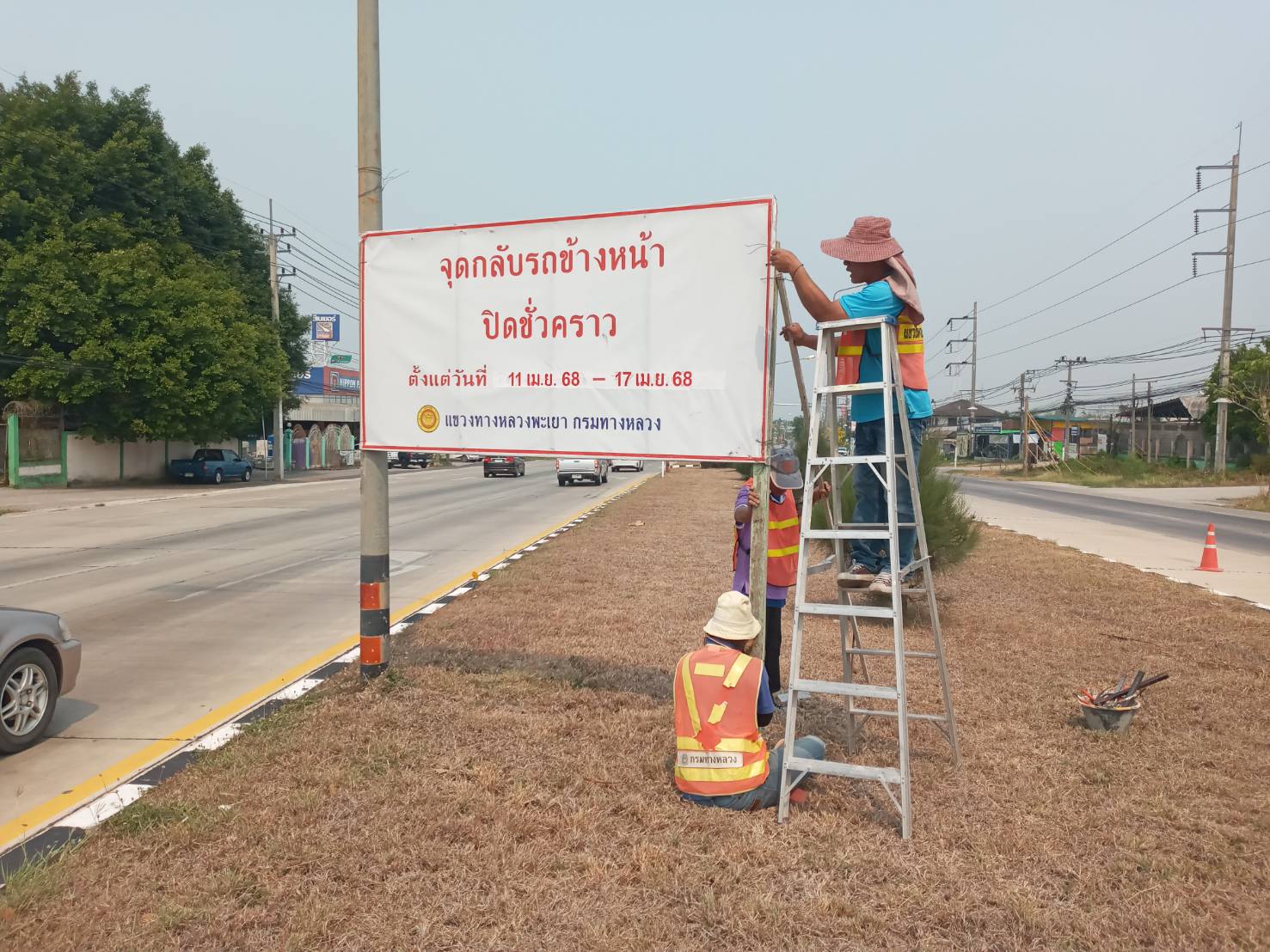 นายพูนศักดิ์ เมาะราษี ผู้อำนวยการแขวงทางหลวงพะเยา มอบหมายให้ งานอำนวยความปลอดภัย แขวงทางหลวงพะเยา ติดตั้งป้ายประชาสัมพันธ์ ปิดจุดกลับรถ(U-TURN) ช่วงเทศกาลสงกรานต์ ประจำปี 2568 ตั้งแต่วันที่ 11 เมษายน 2568 - 17 เมษายน 2568 เพื่อความปลอดภัย และลดจุดเสี่ยงการเกิดอุบัติเหตุในช่วงเทศกาลสงกรานต์ จำนวน 4 จุด