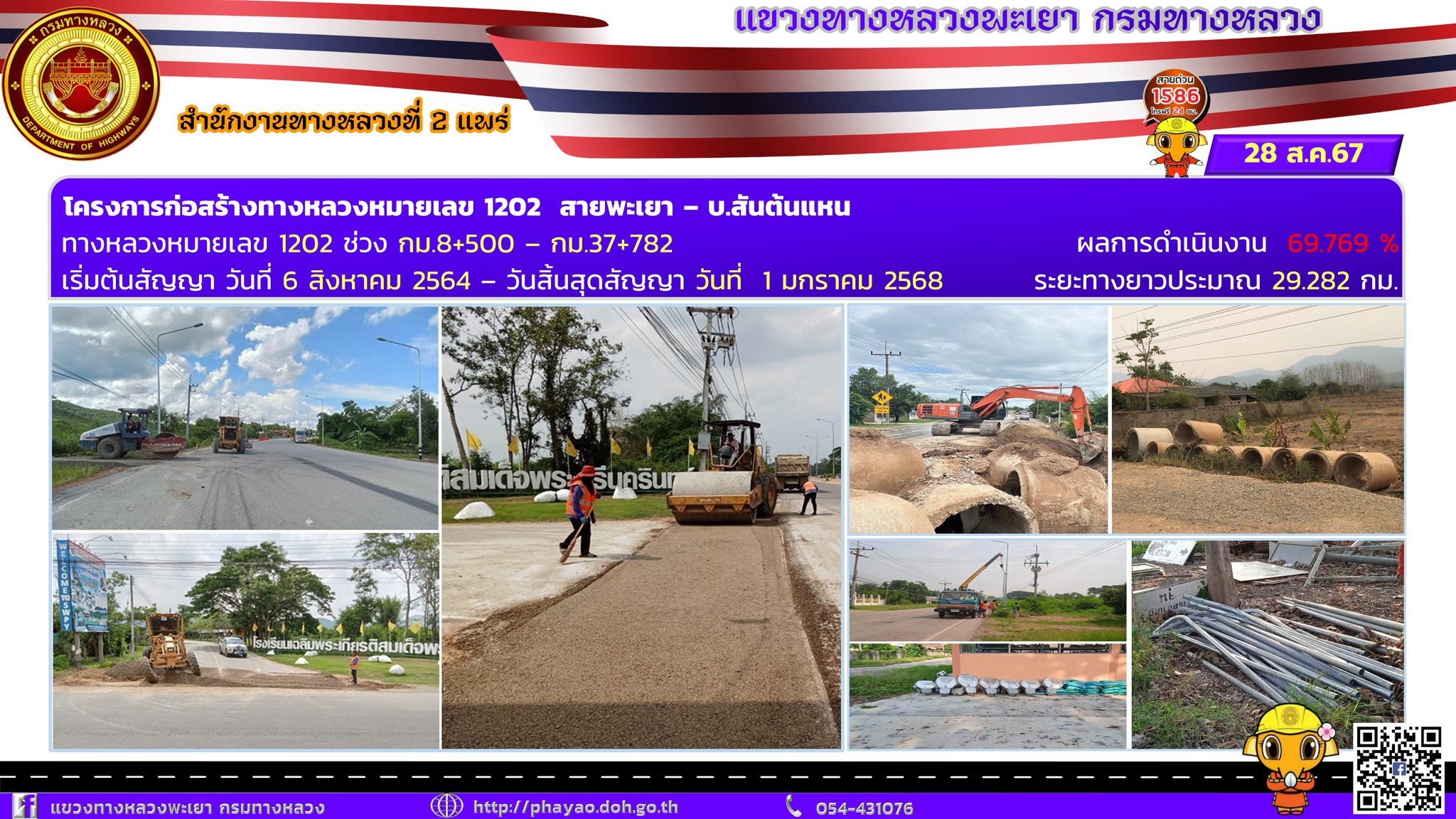 #ความคืบหน้า (เดือนสิงหาคม 2567) โครงการก่อสร้างทางหลวงหมายเลข 1202 สาย สายพะเยา – บ.สันต้นแหน ช่วง กม.8+500 – กม.37+782
