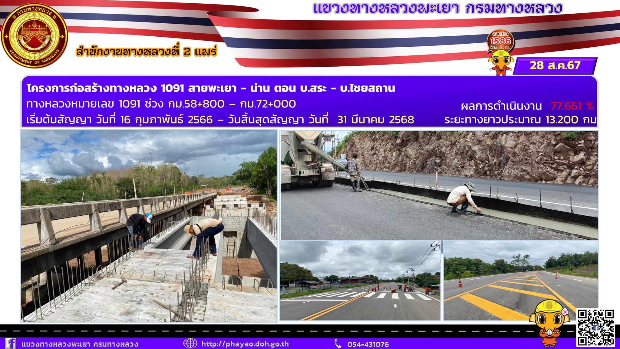 #ความคืบหน้า (เดือนสิงหาคม 2567) โครงการก่อสร้างทางหลวง 1091 สายพะเยา - น่าน ตอน บ.สระ - บ.ไชยสถาน ทางหลวงหมายเลข 1091 ช่วง กม.58+800 – กม.72+000