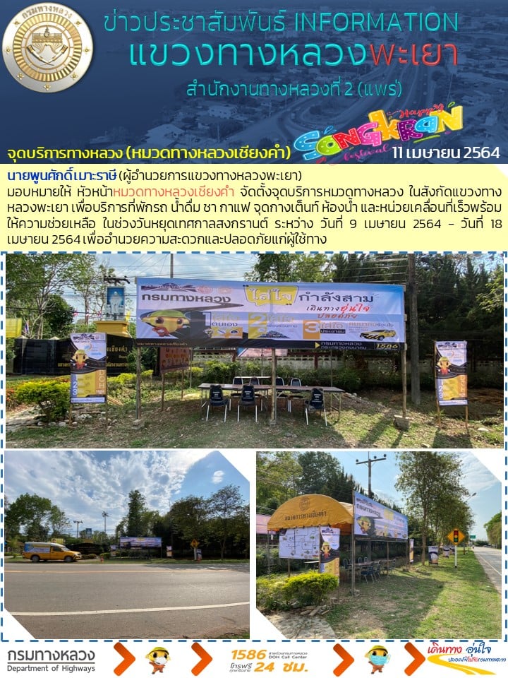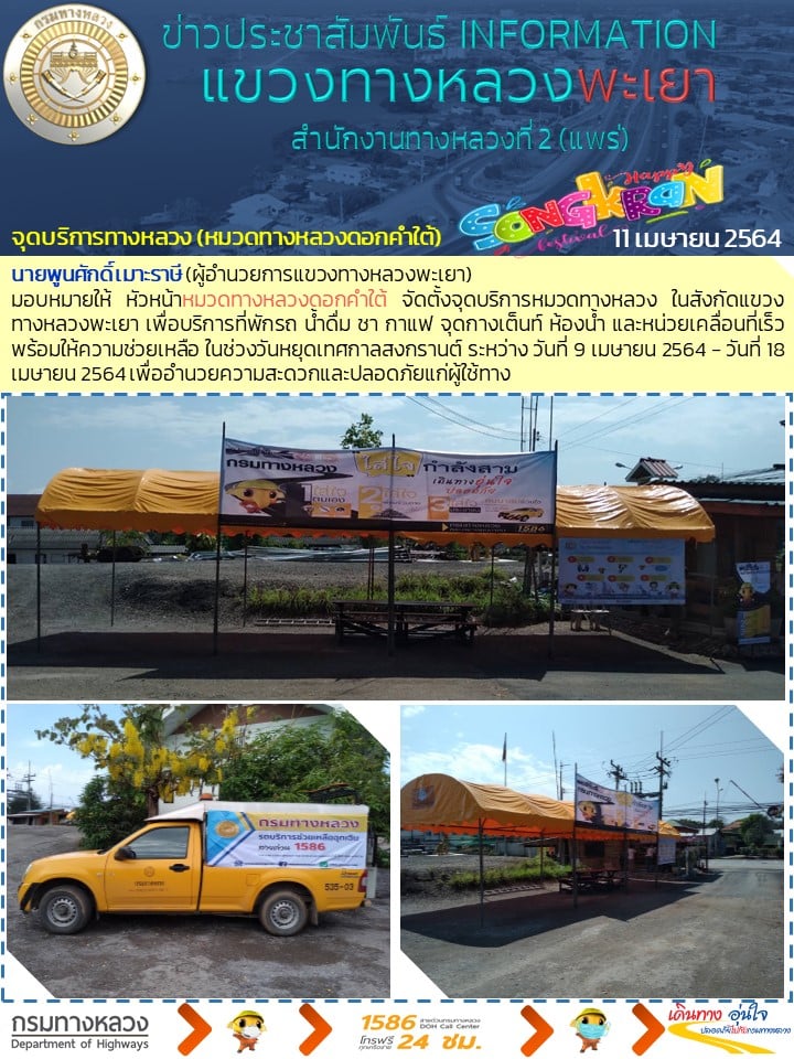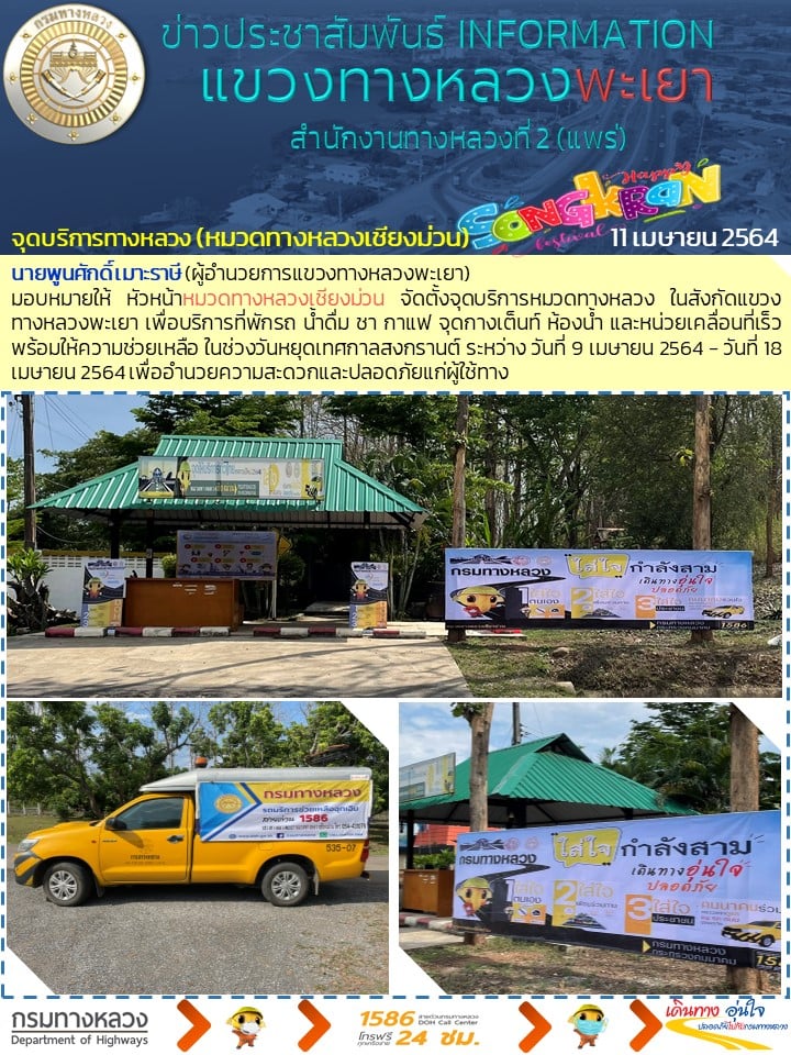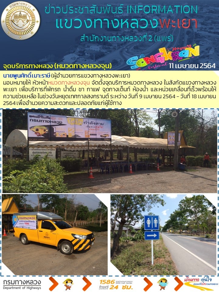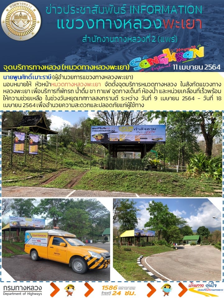 วันที่ 11 เมษายน 2564 ประชาชนที่เดินทาง แวะพักจุดบริการหมวดทางหลวง ในสังกัดแขวงทางหลวงพะเยา บริการที่พักรถ น้ำดื่ม ชา กาแฟ จุดกางเต็นท์ ห้องน้ำและหน่วยเคลื่อนที่เร็วพร้อมให้ความช่วยเหลือ ในช่วงวันหยุดเทศกาลสงกรานต์ ระหว่าง วันที่ 9 เมษายน 2564 - วันที่ 18 เมษายน 2564 เพื่ออำนวยความสะดวกและปลอดภัยแก่ผู้ใช้ทาง