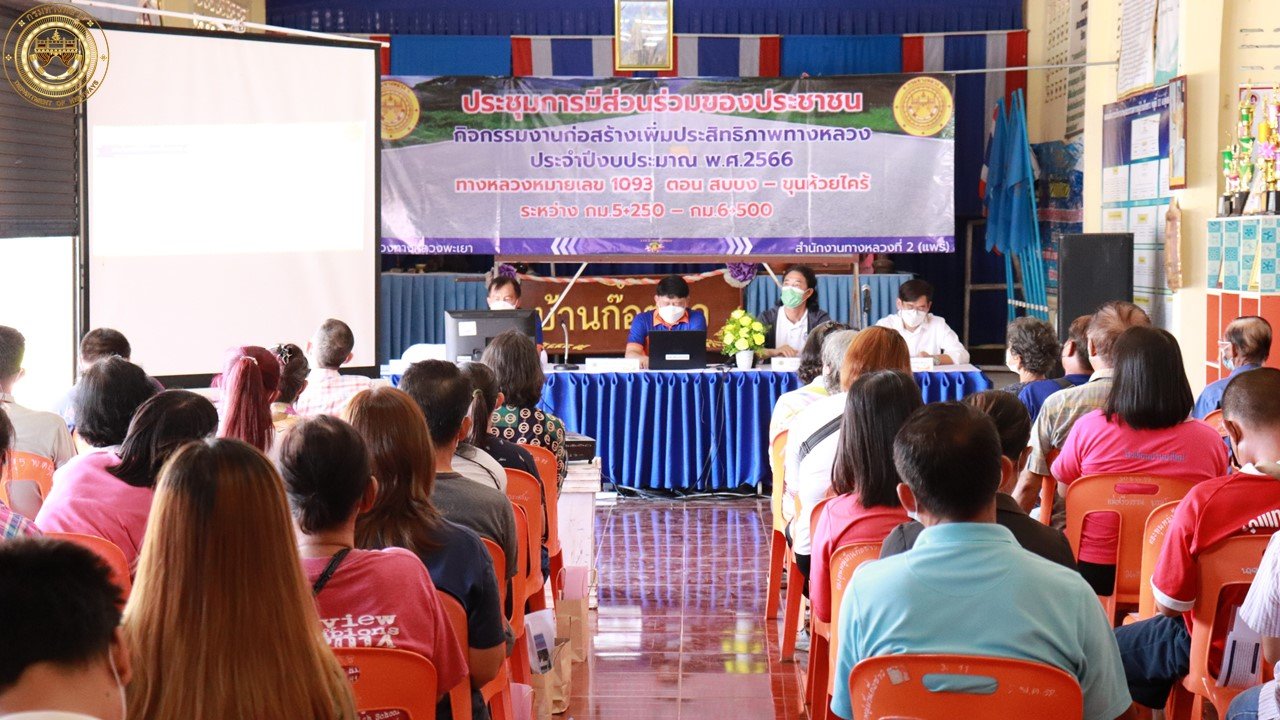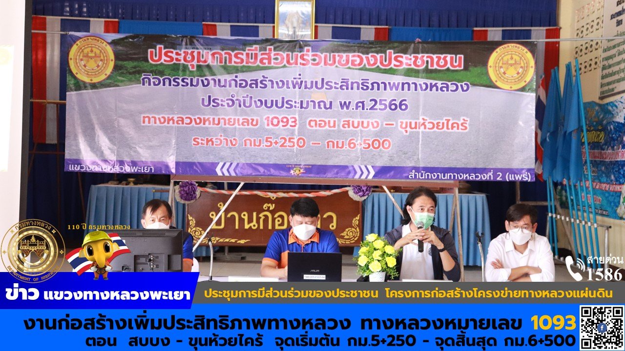 วันที่ 26 กรกฎาคม 2565 แขวงทางหลวงพะเยา จัดการประชุม การมีส่วนร่วมของประชาชน โครงการก่อสร้างโครงข่ายทางหลวงแผ่นดิน กิจกรรมก่อสร้างเพิ่มประสิทธิภาพทางหลวง งานก่อสร้างเพิ่มประสิทธิภาพทางหลวงหมายเลข 1093 ตอน สบบง - ขุนห้วยไคร้ จุดเริ่มต้น กม.5+250 - จุดสิ้นสุด กม.6+500เพื่อรับฟังความคิดเห็น ของประชาชนที่มีผลกระทบต่อการดำเนินการ ก่อสร้าง ตลอดจนผู้ใช้รถใช้ถนน