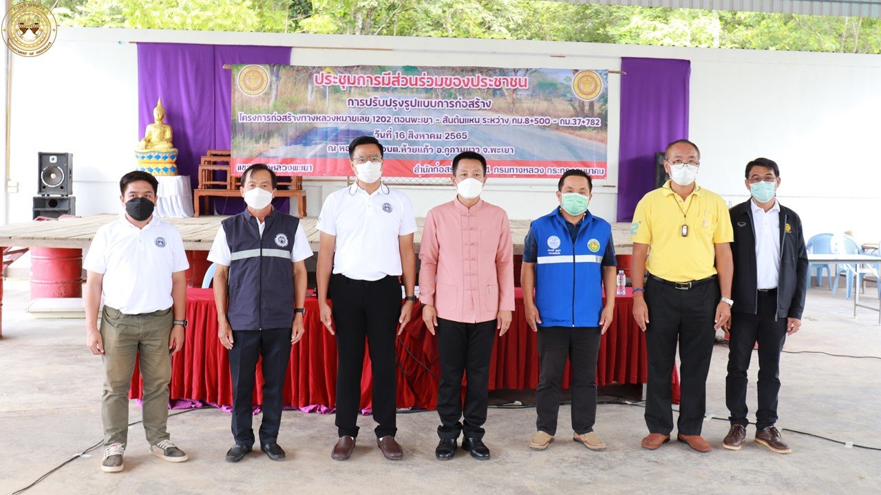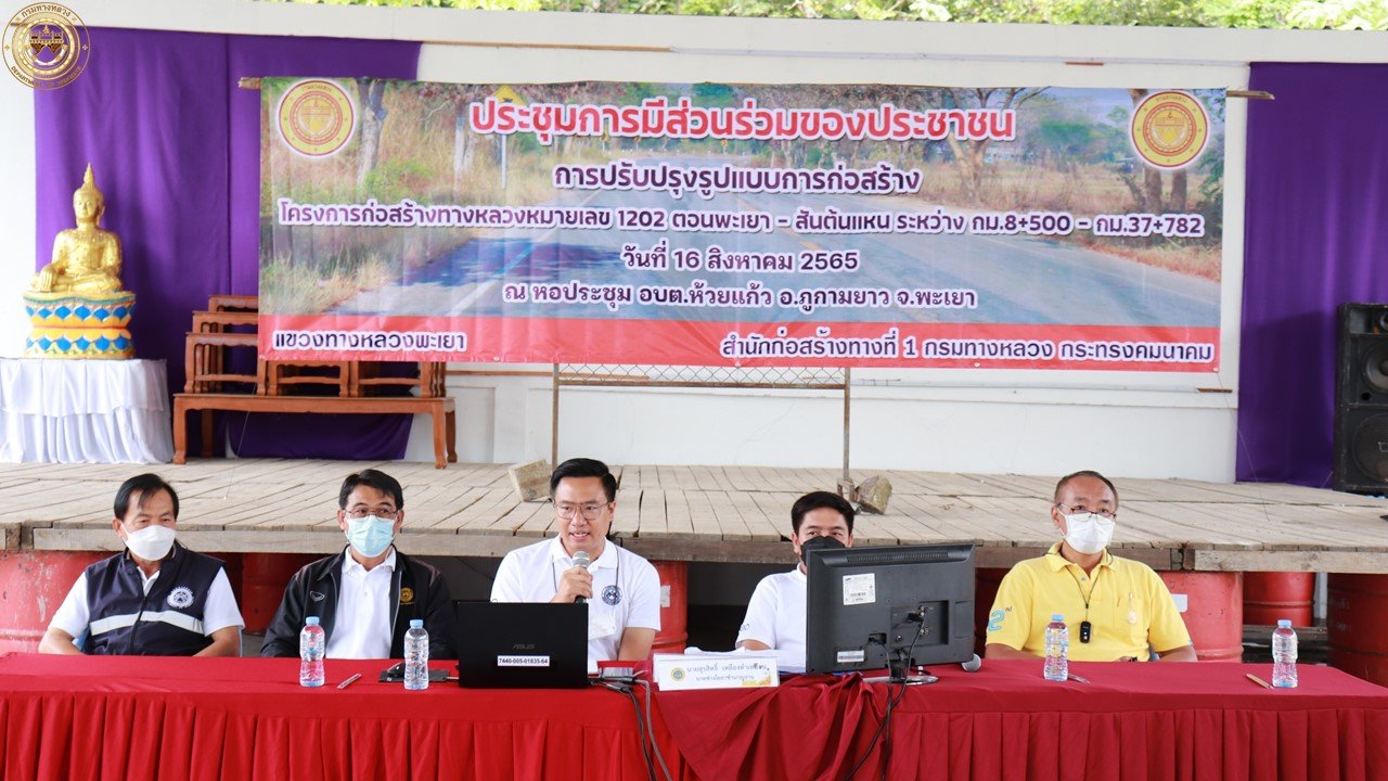 วันที่ 16 สิงหาคม 2565 แขวงทางหลวงพะเยา ร่วมกับ สำนักก่อสร้างที่ 1 กรมทางหลวง กระทรวงคมนาคม จัดการประชุมการมีส่วนร่วมของประชาชน การปรับปรุงรูปแบบการก่อสร้าง โครงการก่อสร้างทางหลวงหมายเลข 1202 ตอนพะเยา - สันต้นแหน ระหว่าง กม.8+500 - กม.37+782 เพื่อรับฟังความคิดเห็น ของประชาชนที่มีผลกระทบต่อการดำเนินการ ก่อสร้าง ตลอดจนผู้ใช้รถใช้ถนน ณ หอประชุม อบต.ห้วยแก้ว อ.ภูกามยาว จ.พะเยา