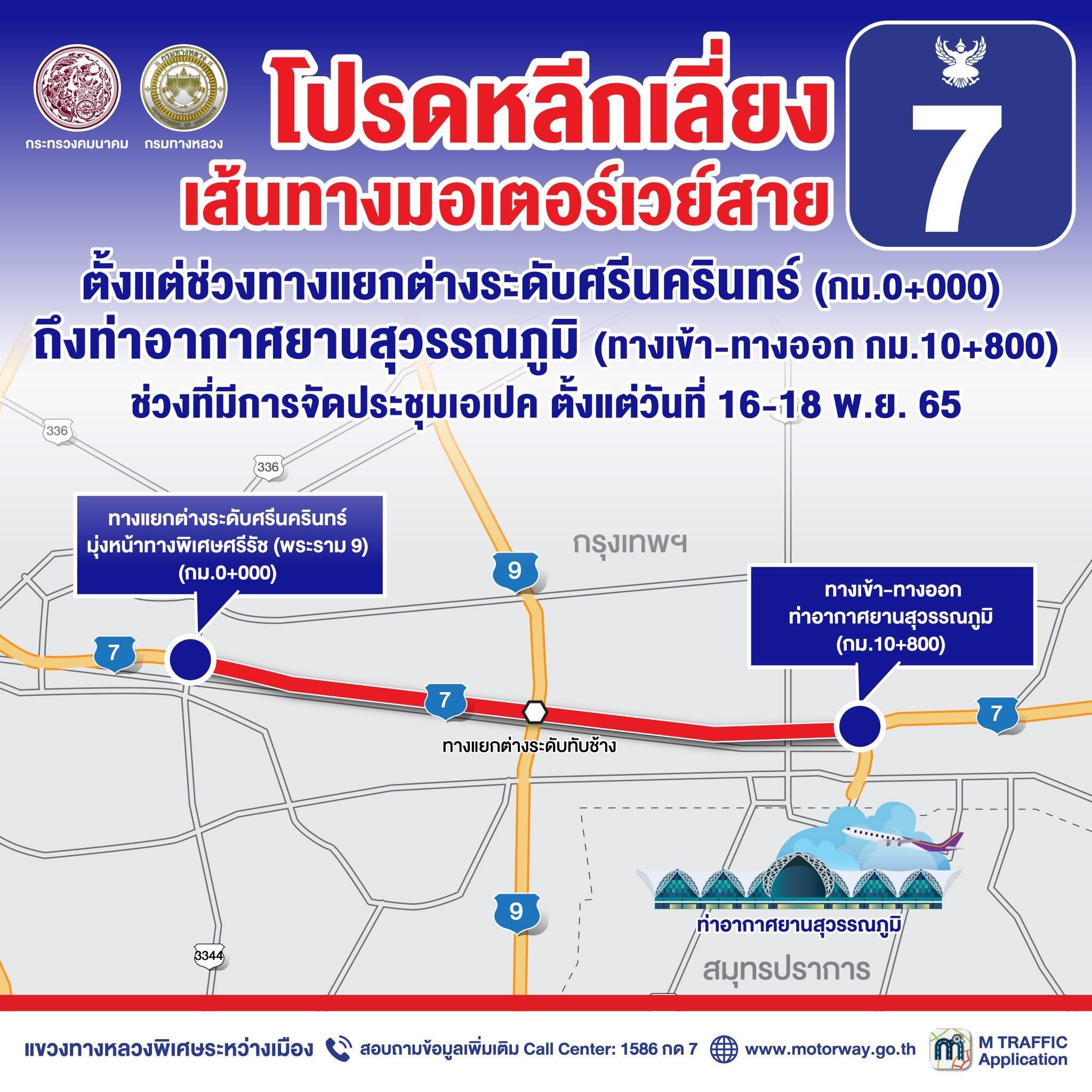 แจ้งหลีกเลี่ยงเส้นทาง มอเตอร์เวย์ ทล.7 ตั้งแต่ ทางแยกต่างระดับศรีนครินทร์ (กม. 0+000) ถึง ท่าอากาศยานสุวรรณภูมิ (ทางเข้า - ทางออก กม. 10+800) ในช่วงที่มีการจัดประชุม APEC ระหว่างวันที่ 16-18 พ.ย. 2565