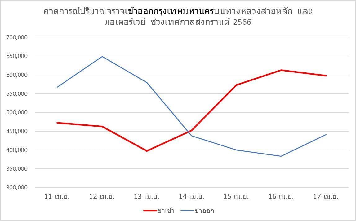 โดยสำนักอำนวยความปลอดภัย กรมทางหลวงได้คาดการณ์ปริมาณจราจรเข้าออกกรุงเทพมหานคร บนทางหลวงสายหลักและมอเตอร์เวย์ 10 เส้นทาง ในช่วงระหว่างวันที่ 11-17 เมษายน 2566 รวมทั้งสิ้น 7,026,157 คัน มากกว่าเทศกาลสงกรานต์ปี 2565 อยู่ 5.3% โดยแบ่งเป็นขาออก 3,458,690 คัน และขาเข้า 3,567,467 คัน โดยคาดว่าวันที่ 12 เมษายน 2566 จะมีปริมาณจราจรขาออกสูงสุดประมาณ 648,530 คัน และวันที่ 16 เมษายน 2566 จะมีปริมาณจราจรขาเข้ากรุงเทพมหานครสูงสุดประมาณ 612,769 คัน ทั้งนี้ เพื่อเป็นการอำนวยความสะดวกแก่ผู้เดินทางและหลีกเลี่ยงปัญหาการจราจรติดขัดในช่วงเทศกาลดังกล่าว กรมทางหลวงจึงได้แนะนำเส้นทางเลือกบนทางหลวงสายหลักและสายรอง เพื่อให้ประชาชนวางแผนการเดินทางล่วงหน้า โดยแบ่งเป็นภาคต่าง ๆ ดังนี้