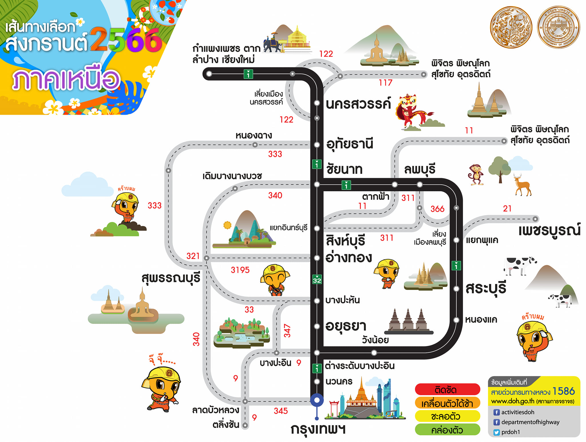 กรมทางหลวงแนะนำเส้นทางเลือกจากกรุงเทพฯ สู่ภูมิภาคต่าง ๆ ช่วงเทศกาลสงกรานต์ 2566 เพื่อให้ผู้ใช้เส้นทางได้รับความสะดวก รวดเร็วในการเดินทาง สอบถามโทร 1586 ฟรีทุกเครือข่ายตลอด 24 ชั่วโมง