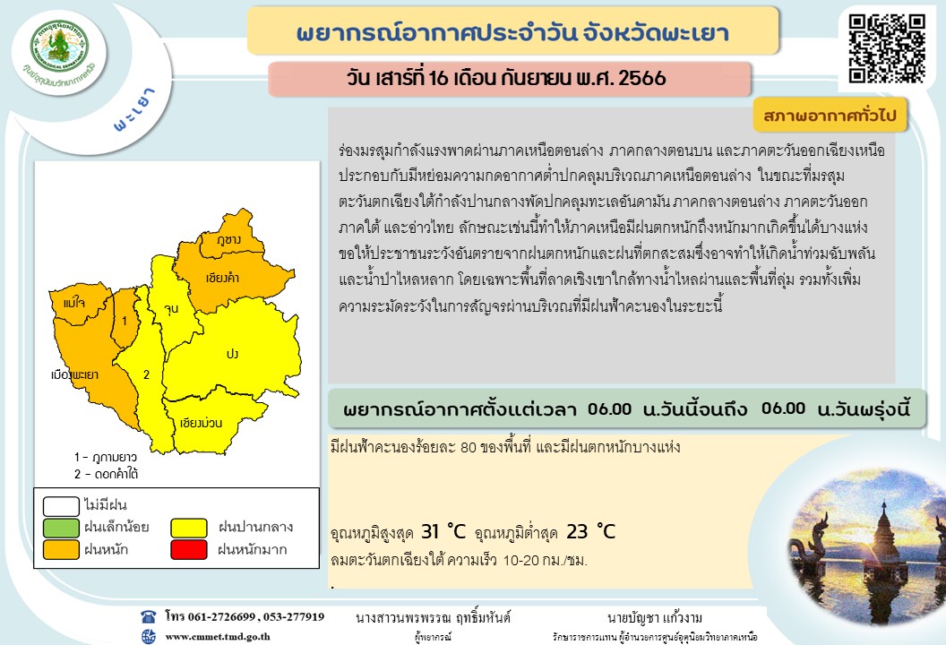 เนื่องด้วยจังหวัดพะเยา ในหลายพื้นที่ยังคงมีฝนตกหนัก ถึงหนักมาก ขอให้ประชาชนระวังอันตรายจากฝนตกหนักและฝนที่ตกสะสมซึ่งอาจทำให้เกิดน้ำท่วม ฉับพลันและน้ำป่าไหลหลาก โดยเฉพาะพื้นที่ลาดเชิงเขาใกล้ทางน้ำไหลผ่านและพื้นที่ลุ่ม