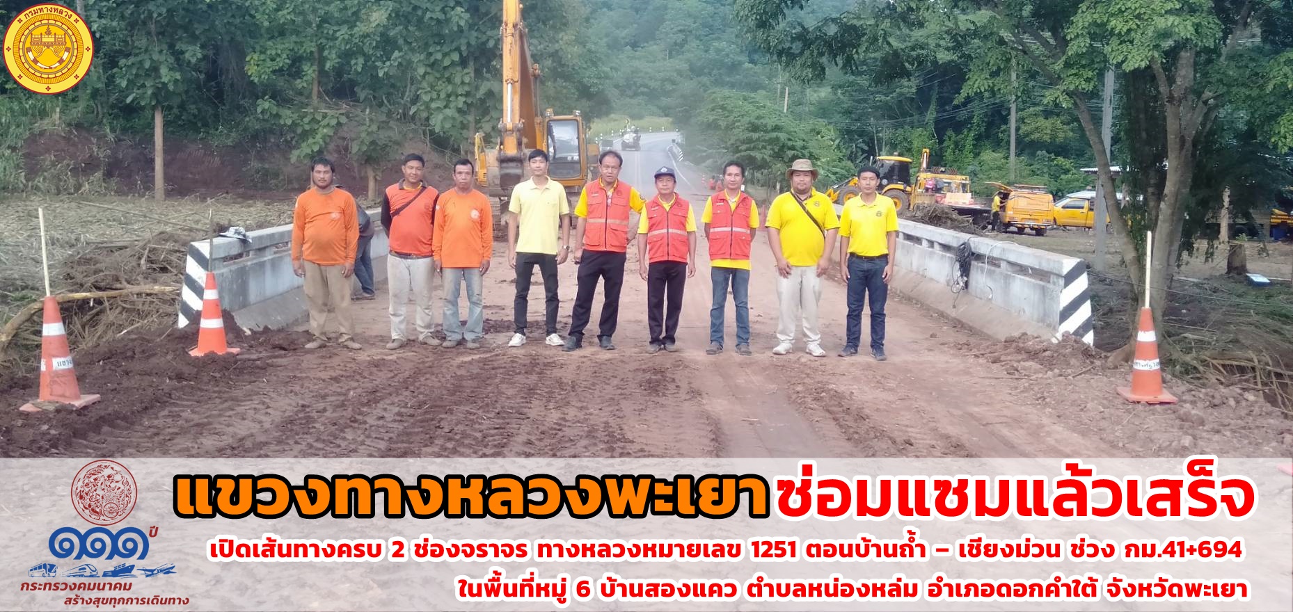 #แขวงทางหลวงพะเยา ซ่อมแซมแล้วเสร็จ เปิดช่องจราจร ครบ 2 ช่องทาง แขวงทางหลวงพะเยา สำนักงานทางหลวงที่ 2 (แพร่) กรมทางหลวง กระทรวงคมนาคม ดำเนินการซ่อมแซมคอสะพานขาด ทางหลวงหมายเลข 1251 ตอนบ้านถ้ำ – เชียงม่วน ช่วง กม.41+694 ในพื้นที่หมู่ 6 บ้านสองแคว ตำบลหน่องหล่ม อำเภอดอกคำใต้ จังหวัดพะเยา แล้วเสร็จเป็นที่เรียบร้อย โปรดขับขี่ด้วยความระมัดระวัง ปฏิบัติตามป้ายเตือน ป้ายแนะนำ เพื่อความปลอดภัยของผู้ขับขี่