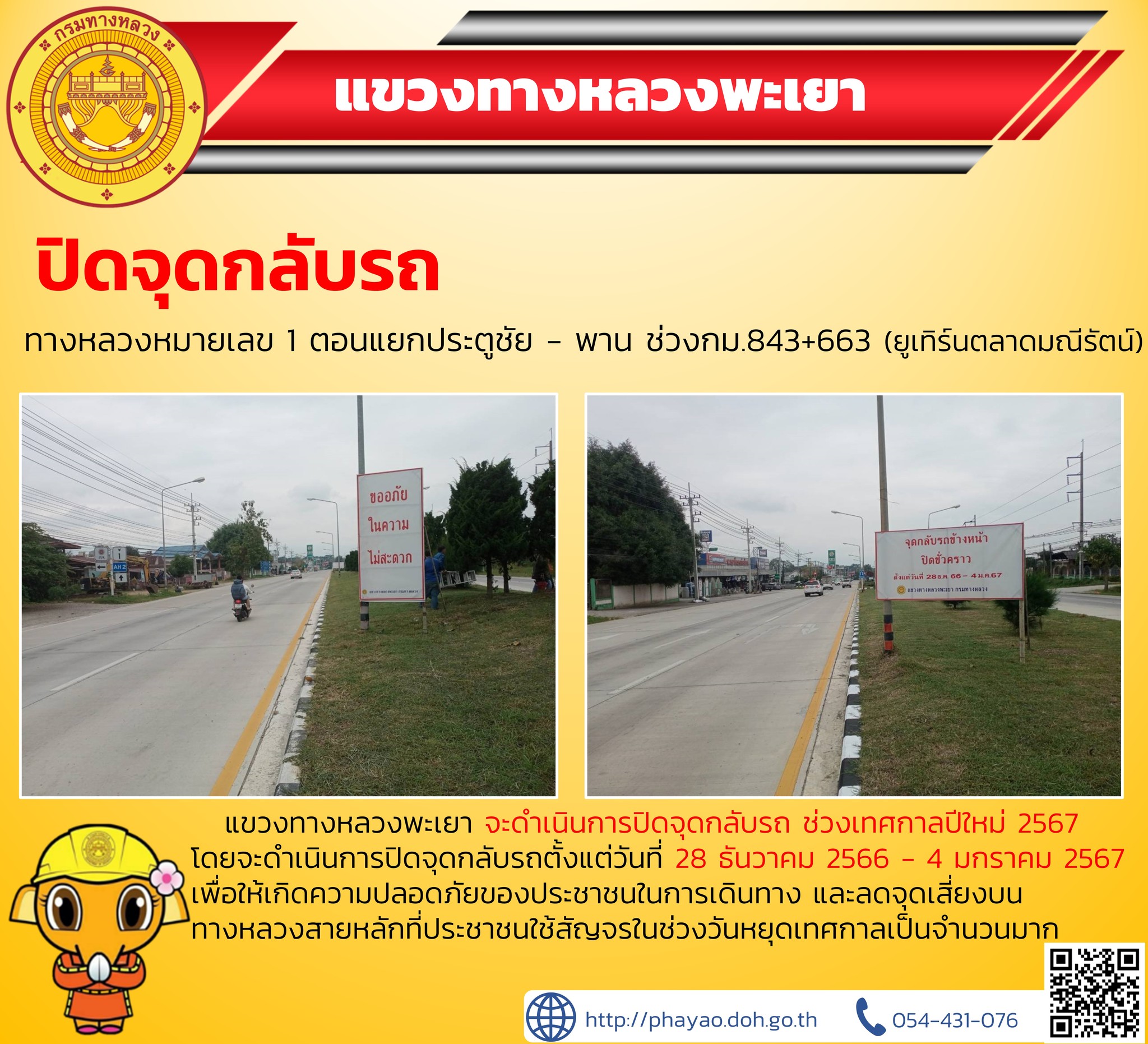 ข่าวประชาสัมพันธ์แขวงทางหลวงพะเยา จะดำเนินการปิดจุดกลับรถ ช่วงเทศกาลปีใหม่ 2567