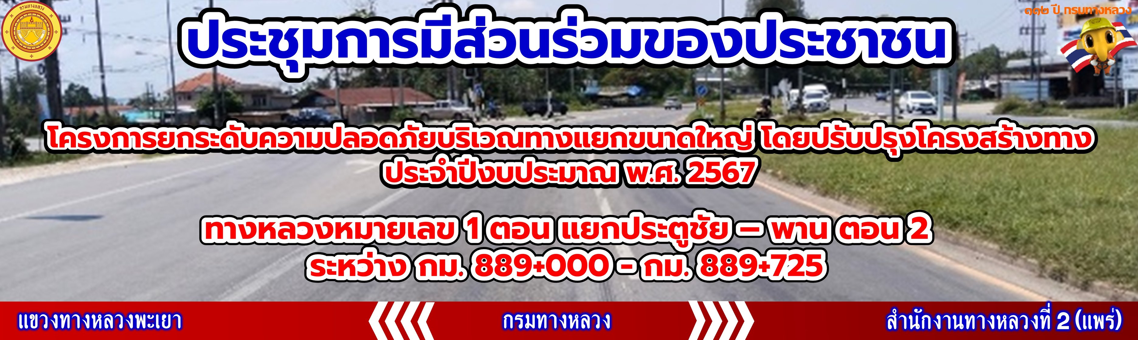 ขอเชิญชวนประชาชน ผู้ที่สนใจ เข้าร่วมประชุมการมีส่วนร่วมของประชาชน โครงการยกระดับความปลอดภัยบริเวณทางแยกขนาดใหญ่ โดยปรับปรุงโครงสร้างทาง ทางหลวงหมายเลข 1 ตอน แยกประตูชัย – พาน ตอน 2 ระหว่าง กม. 889+000 - กม. 889+725 ประจำปีงบประมาณ พ.ศ. 2567