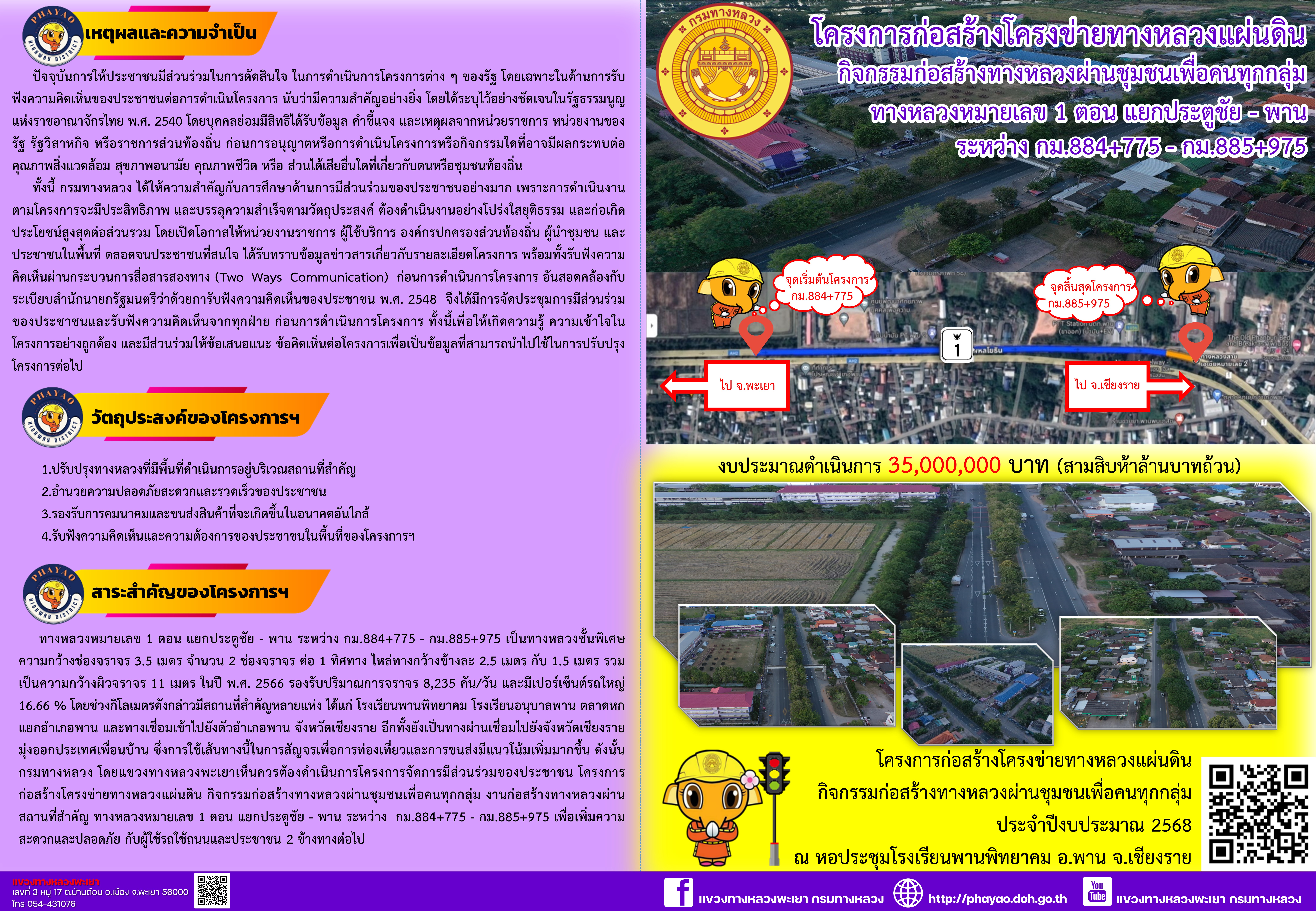 ทางหลวงหมายเลข 1 ตอน แยกประตูชัย - พาน ระหว่าง กม.884+775 - กม.885+975 วันที่ 16 ธันวาคม 2567 เวลา 08.30 น. ณ หอประชุมโรงเรียนพานพิทยาคม