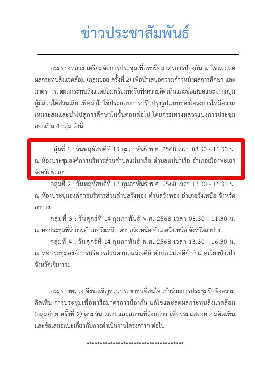 (กล่มที่ 1 ) วันพฤหัสบดี ที่ 13 กุมภาพันธ์ 2568 เวลา 08.30 – 11.30 น. ณ ห้องประชุมองค์การบริหารส่วนตำบลแม่นาเรือ อำเภอเมืองพะเยา จังหวัดพะเยา
