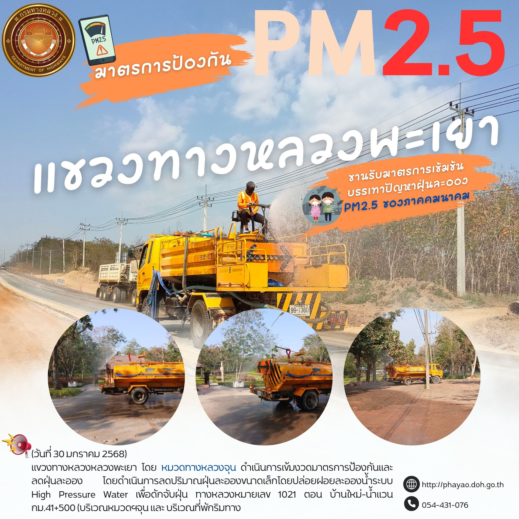 โดยหมวดทางหลวงจุน ดำเนินการเข้มงวดมาตรการป้องกันและลดฝุ่นละออง โดยดำเนินการลดปริมาณฝุ่นละอองขนาดเล็กโดยปล่อยฝอยละอองน้ำระบบ High Pressure Water เพื่อดักจับฝุ่น ทางหลวงหมายเลข 1021 ตอน บ้านใหม่-น้ำแวนกม.41+500 (บริเวณหมวดฯจุน และ บริเวณที่พักริมทาง เพื่อช่วยลดปริมาณฝุ่นละอองขนาดเล็กในอากาศ ที่เป็นอันตราย และส่งผลกระทบต่อคุณภาพชีวิตของประชาชนและสิ่งแวดล้อมในพื้นที่จังหวัดพะเยา