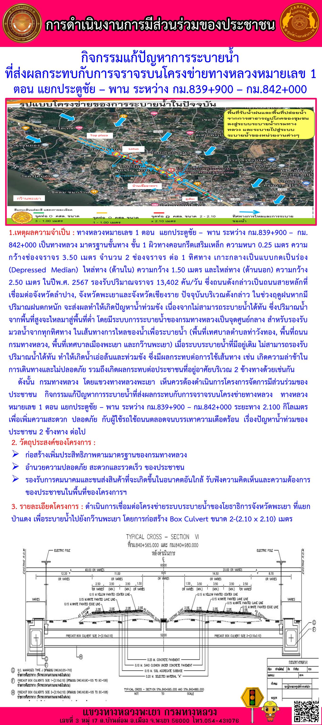 นายพูนศักดิ์ เมาะราษี ผู้อำนวยการแขวงทางหลวงพะเยา แจ้งความคืบหน้าโครงการ กิจกรรมแก้ปัญหาการระบายน้ำที่ส่งผลกระทบกับการจราจรบนโครงข่ายทางหลวง ทางหลวงหมายเลข 1 ตอน แยกประตูชัย – พาน ระหว่าง กม.839+900 – กม.842+000