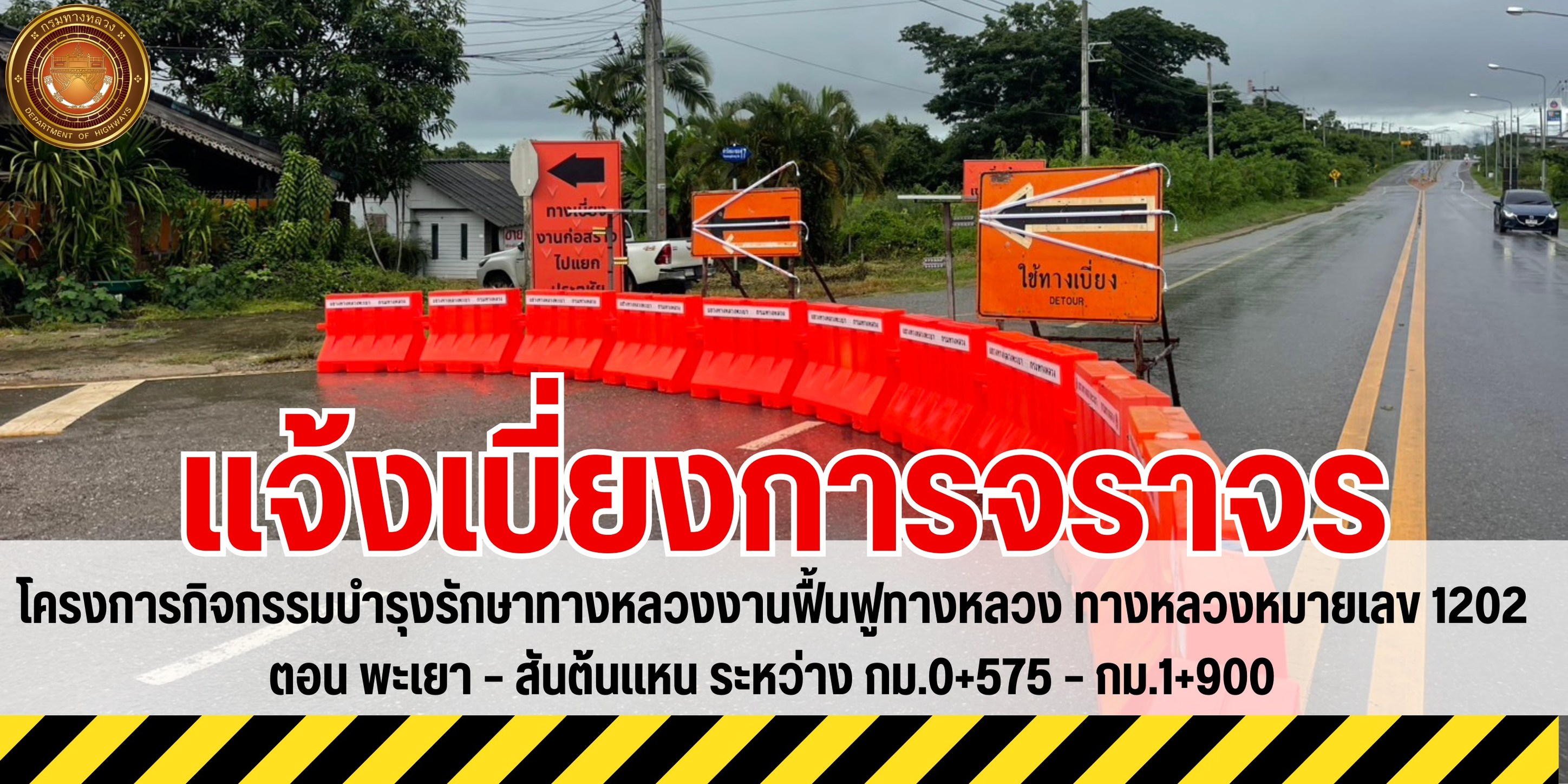 ประชาสัมพันธ์แจ้งการเบี่ยงจราจร โครงการก่อสร้าง กิจกรรมบำรุงรักษาทางหลวงงานฟื้นฟูทางหลวง ทางหลวงหมายเลข 1202 ตอน พะเยา – สันต้นแหน ระหว่าง กม.0+575 – กม.1+900 ให้ผู้ใช้เส้นทางที่มุ่งหน้าไปอำเภอเมืองพะเยา (สี่แยกประตูชัย) โปรดใช้เส้นทางเลี่ยง ช่วงกม.1+900 ให้ทำการเลี้ยวซ้ายตรงทางเบี่ยง ป้ายโรงแรมธนัญธร โดยเดินทางตามป้ายแนะนำที่ได้ทำการติดตามเส้นทางเพื่อความปลอดภัยของผู้ใช้เส้นทางดังกล่าว