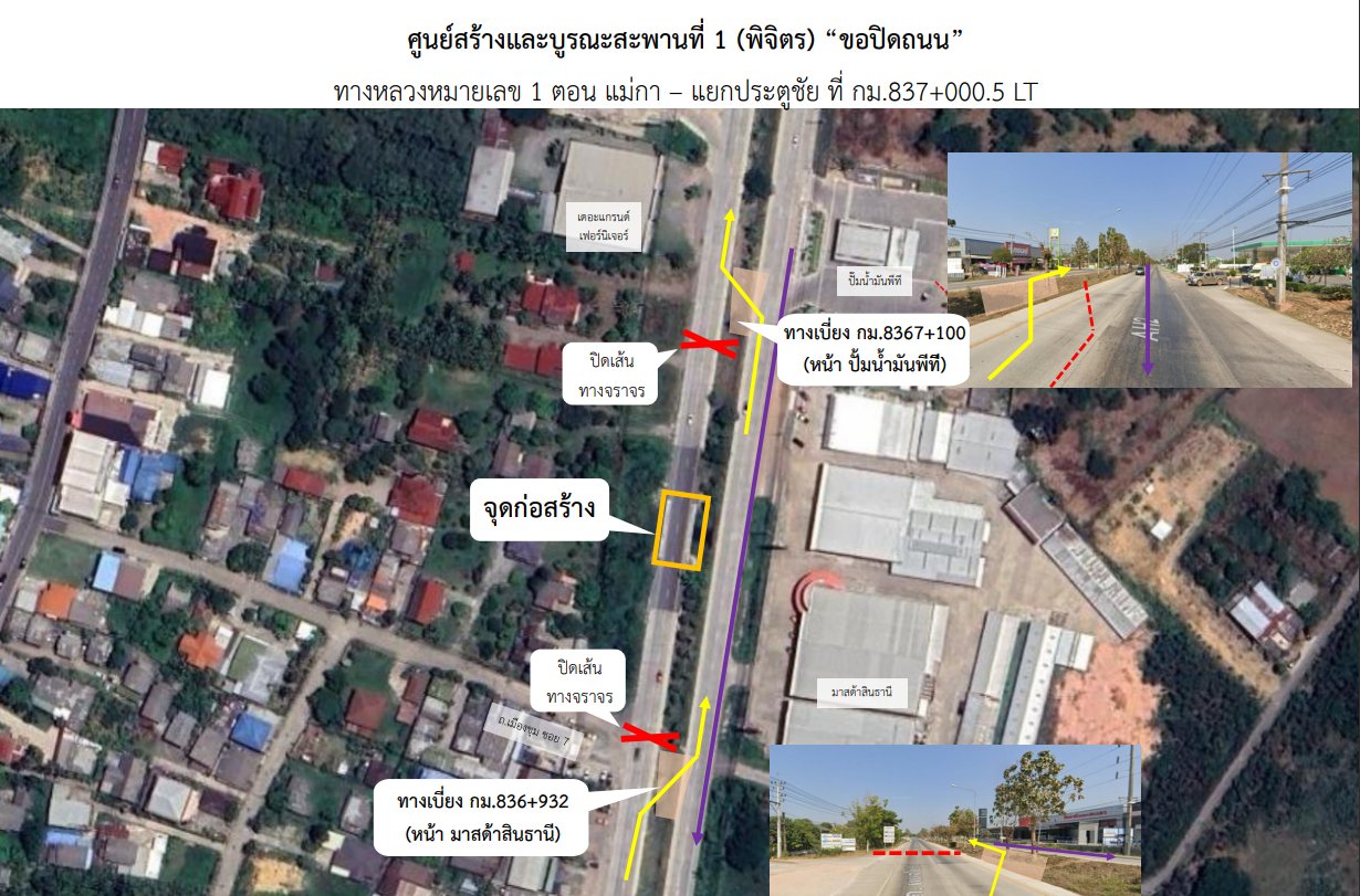 ด้วยโครงการก่อสร้างบูรณะและปรับปรุงสะพานและท่ออุโมงค์ คสล.ทางหลวงหมายเลข 1 ตอนแม่กา - แยกประตูชัย ช่วงกม.834+000.5 LT เริ่มต้นสัญญาวันที่ 1 พฤษภาคม 2568 สิ้นสุดสัญญา วันที่ 28 พฤศจิกายน 2568 ระยะทำการ จำนวน 212 วัน จะทำทำการเบี่ยงการจราจรระหว่างดำเนินการก่อสร้าง เพื่อความปลอดภัยต่อผู้สัญจรบริเวณพื้นที่ก่อสร้าง บริเวณหน้าบริษัทมาสด้าสินธานี จำกัด (สาขาพะเยา) ช่วงกม.836+932 ถึงบริเวณหน้าปั๊มน้ำมัน PT แม่ต๋ำ พะเยา