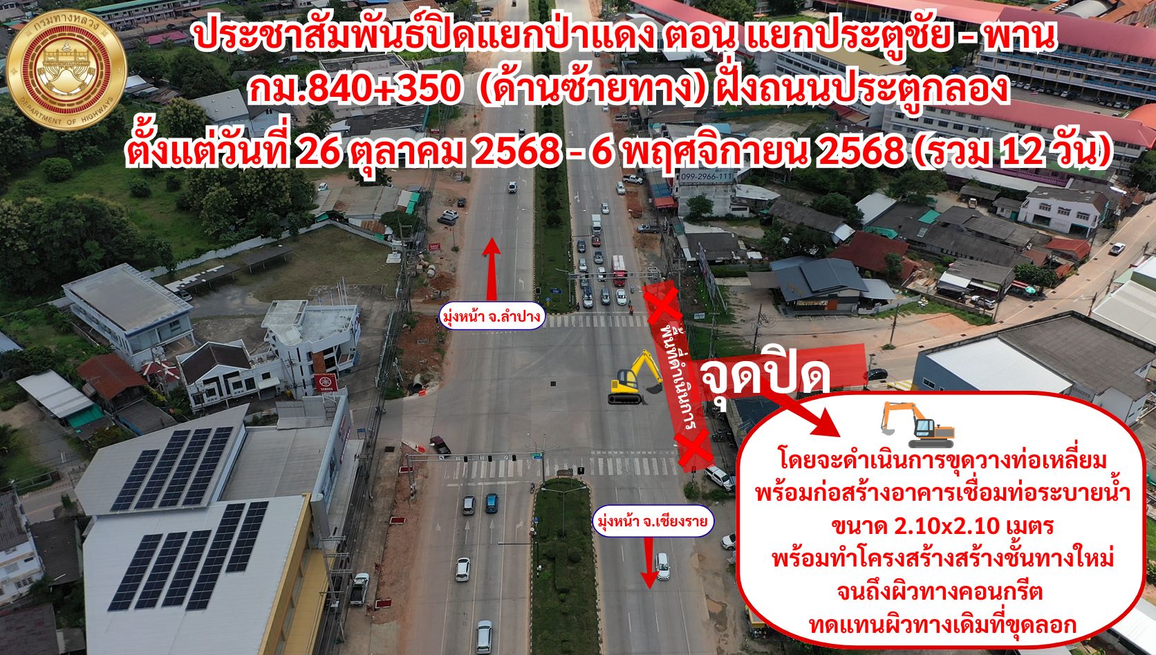 xปิดแล้วx...ทางแยกป่าแดง ทางหลวงหมายเลข 1 ตอน แยกประตูชัย - พาน กม.840+350 (ด้านซ้ายทาง) ฝั่งถนนประตูกลอง ตั้งแต่วันที่ 26 ตุลาคม 2568 - 6 พฤศจิกายน 2568 (รวม 12 วัน)