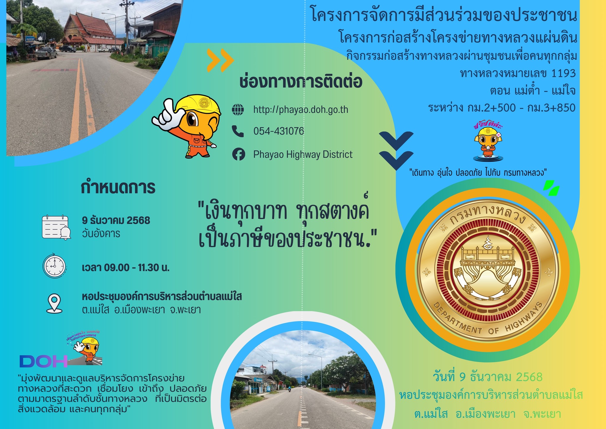 แขวงทางหลวงพะเยา ขอเชิญชวนประชาชน / หน่วยงานราชการ / หน่วยงานเอกชน / สื่อมวลชน ตลอดถึงผู้ที่สนใจทุกท่าน เข้าร่วมประชุมโครงการจัดการมีส่วนร่วมของประชาชน โครงการก่อสร้างโครงข่ายทางหลวงแผ่นดิน กิจกรรมก่อสร้างทางหลวงผ่านชุมชนเพื่อคนทุกกลุ่ม ทางหลวงหมายเลข 1193 ตอน แม่ต๋ำ - แม่ใจ ระหว่าง กม.2+500 - กม.3+850 วันอังคาร ที่ 9 ธันวาคม 2568 เวลา 09.00 น. - 11.30 น.