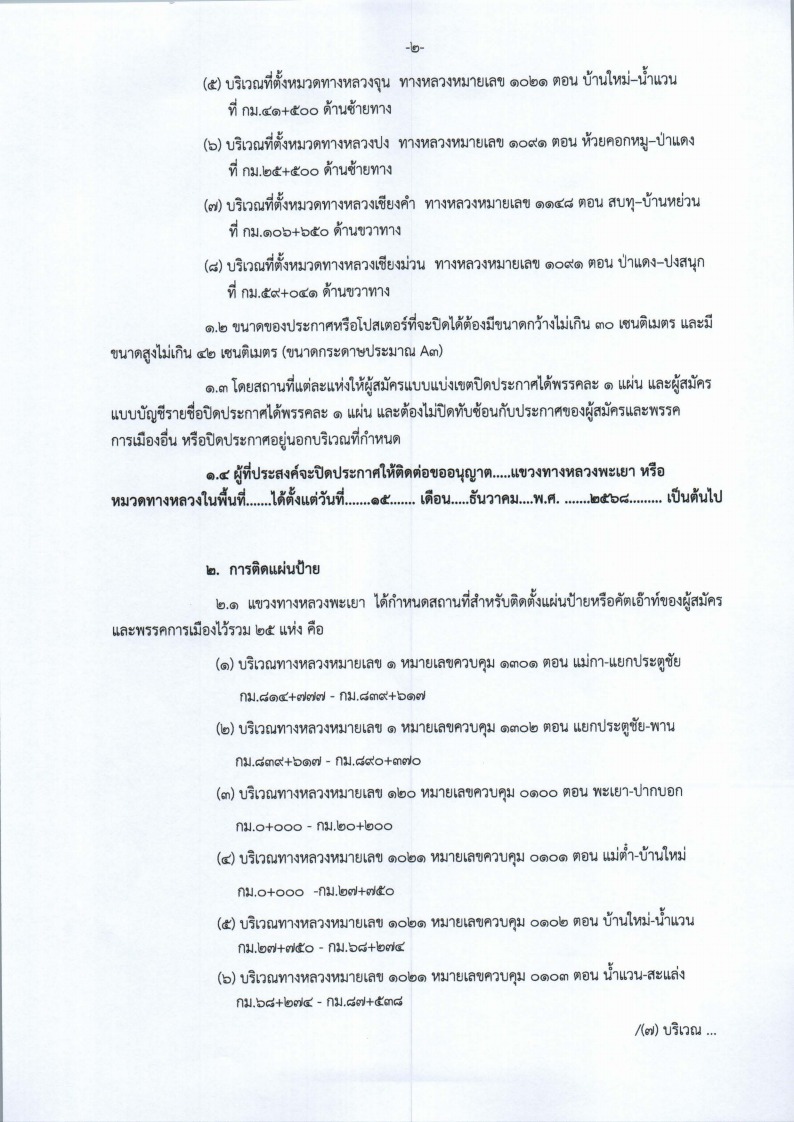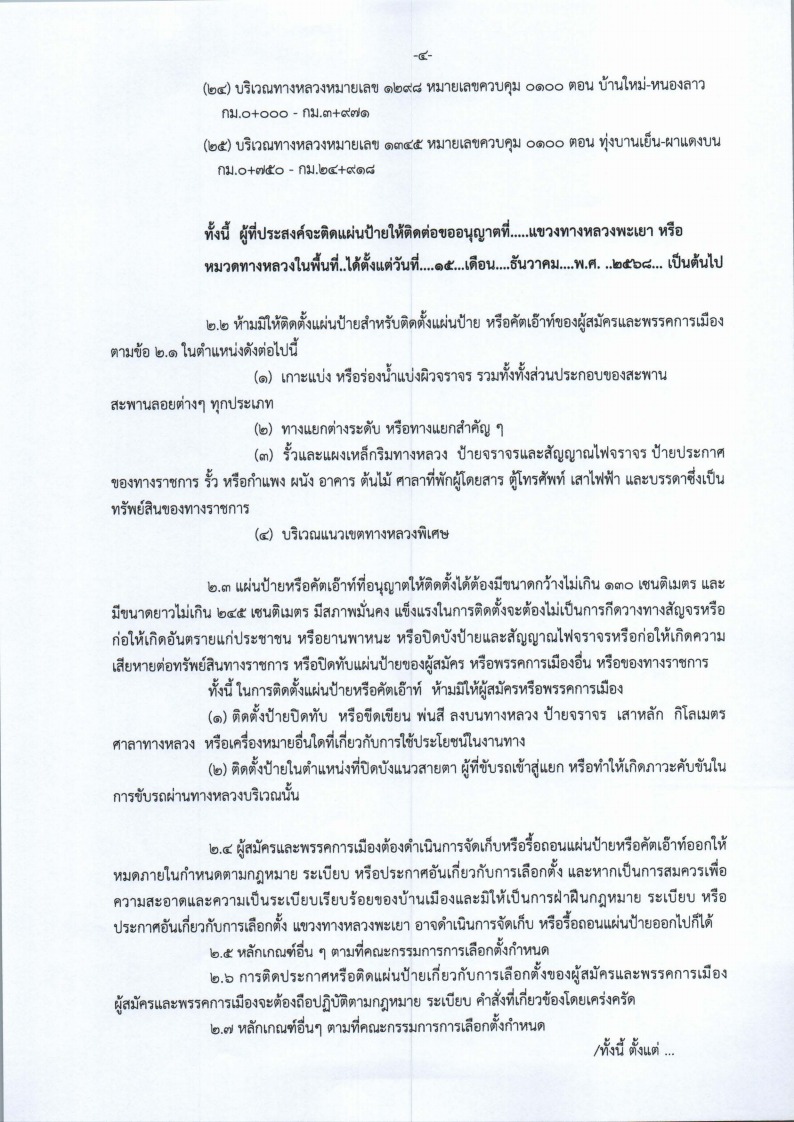 Xห้ามมิให้ผู้ใดติดตั้งป้ายหาเสียงเลือกตั้งในเขตทางหลวงก่อนวันที่ 15 ธันวาคม 2568 และต้องได้รับอนุญาตจากแขวงทางหลวงพะเยาเป็นลายลักษณ์อักษร ตามประกาศของแขวงทางหลวงพะเยา