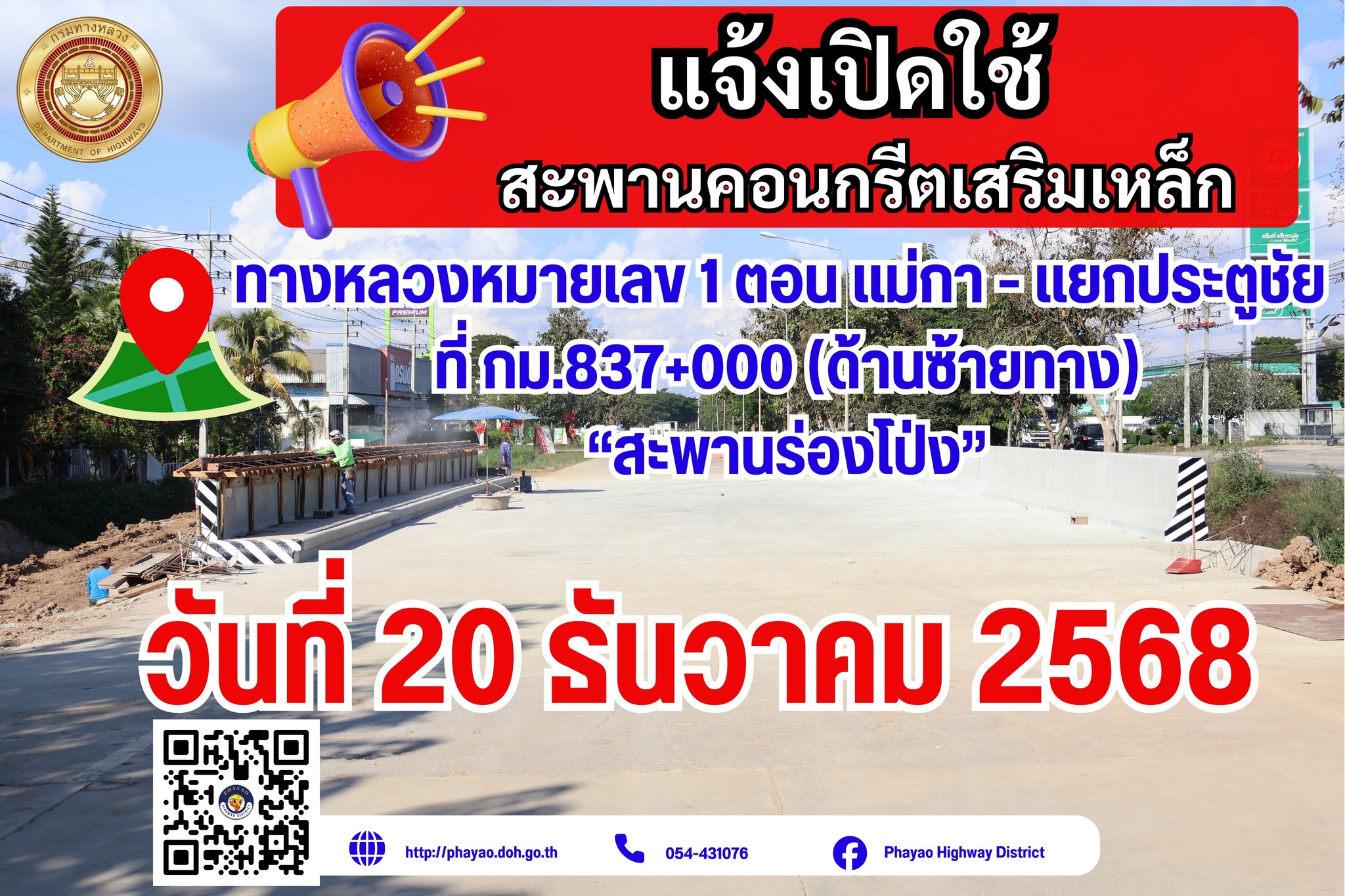 แขวงทางหลวงพะเยา แจ้งเปิดใช้สะพานคอนกรีตเสริมเหล็ก "(สะพานร่องโป่ง)" โครงการก่อสร้างสะพาน คสล. ในทางหลวงหมายเลข 1 ตอนแม่กา - แยกประตูชัย ที่ กม.837+000 (ด้านซ้ายทาง) เพื่อเป็นอำนวยความสะดวกและปลอดภัย กับผู้ใช้เส้นทางในช่วงเทศกาลปีใหม่ 2569 โดยจะดำเนินการเปิดให้ประชาชนได้สัญจร ตั้งแต่วันที่ 20 ธันวาคม 2568 เป็นต้นไป
