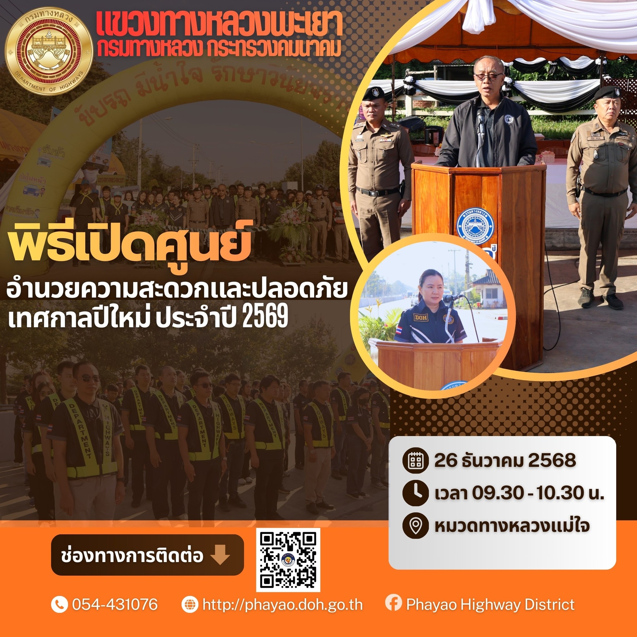 นายพูนศักดิ์ เมาะราษี ผู้อำนวยการแขวงทางหลวงพะเยา เป็นประธาน ในพิธีเปิดศูนย์อำนวยความสะดวกและปลอดภัยช่วงเทศกาลปีใหม่ 2569 โดยมีหน่วยงานเข้าร่วมพิธี ดังนี้