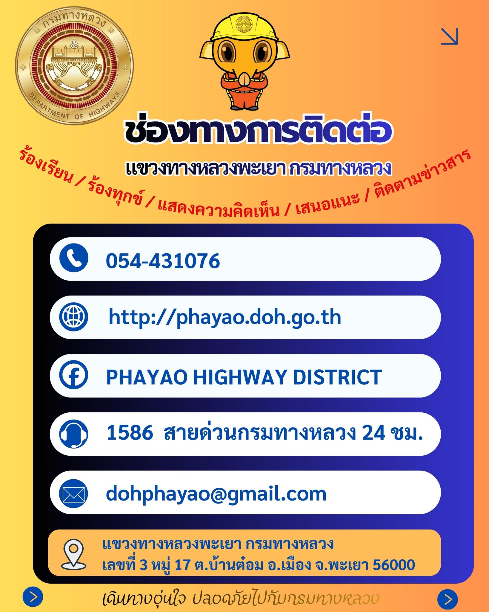 ช่องทางการติดต่อ : แขวงทางหลวงพะเยา กรมทางหลวง