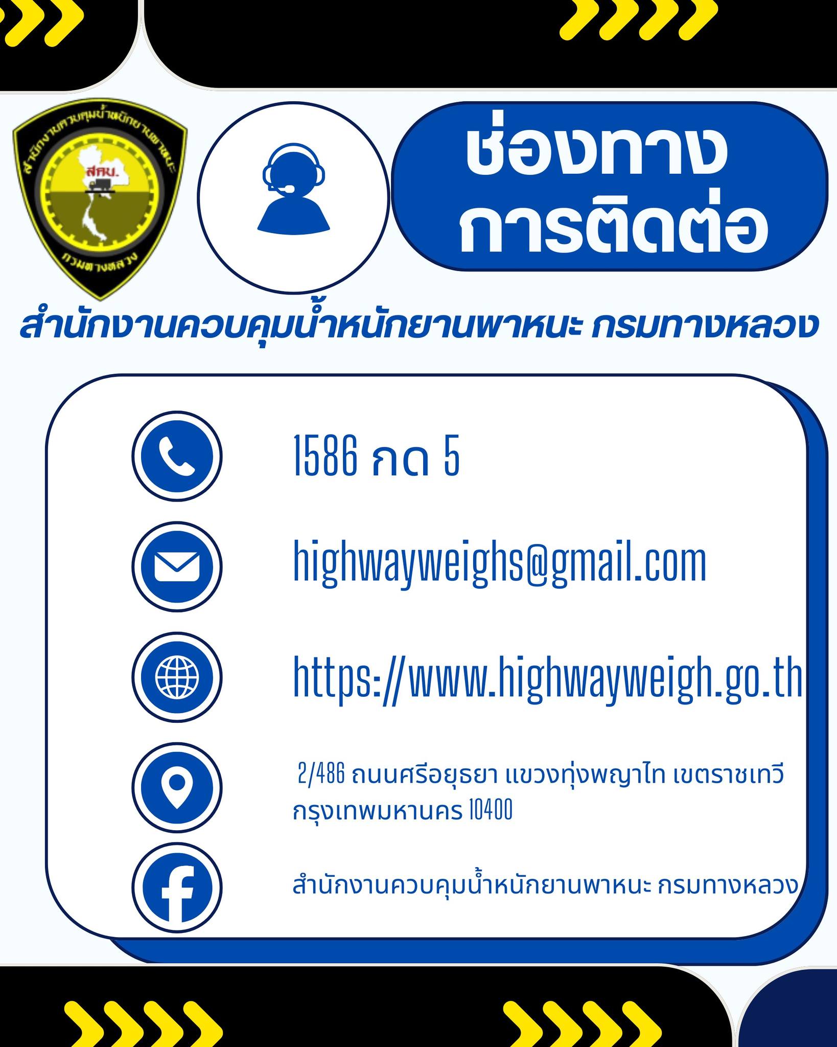 ช่องทางการติดต่อ : สำนักงานควบคุมน้ำหนักยานพาหนะ กรมทางหลวง