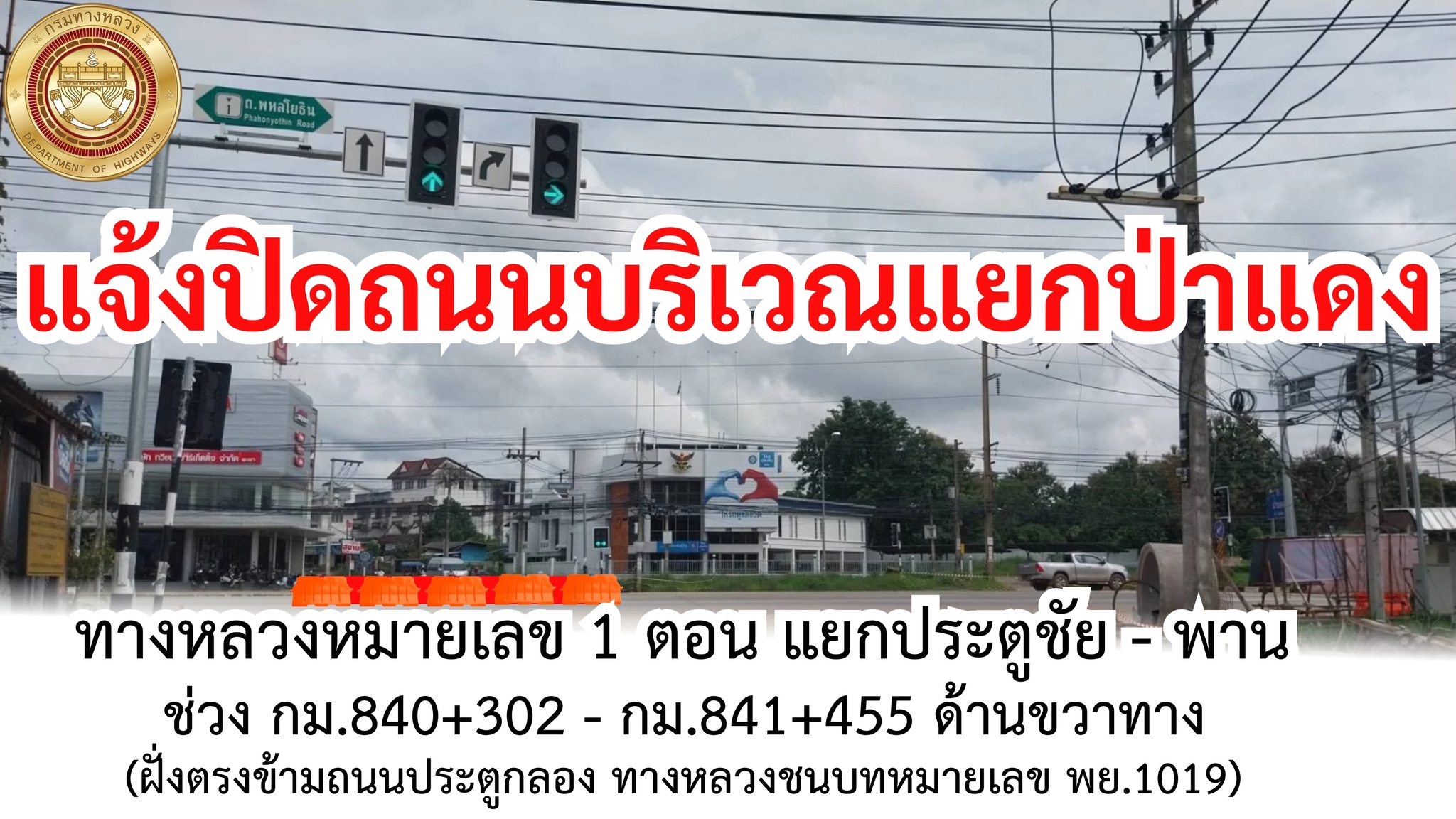 แจ้งปิดถนนบริเวณแยกป่าแดง ทางหลวงหมายเลข 1 ตอน แยกประตูชัย - พาน ช่วง กม.840+302 - กม.841+455 ด้านขวาทาง (ฝั่งตรงข้ามถนนประตูกลอง / ทางหลวงชนบทหมายเลข พย.1019) โดยการประปาส่วนภูมิภาคสาขาพะเยา จะดำเนินการย้ายแนวท่อประปา