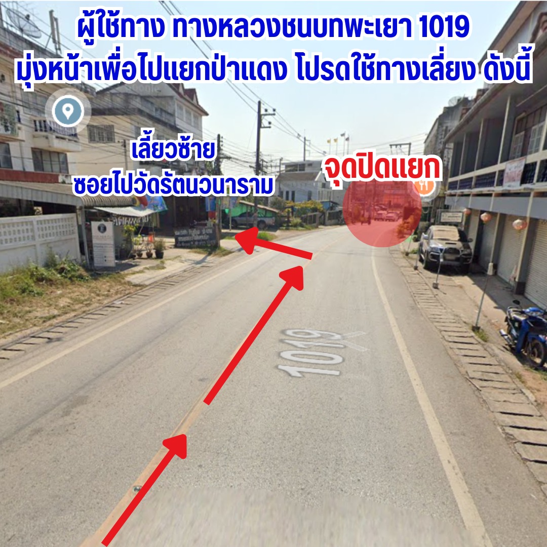 สำหรับผู้ใช้เส้นทาง ทางหลวงชนบทหมายเลข 1019 โปรดหลีกเลี่ยงเส้นทางดังกล่าว ให้ใช้เส้นทางเลี่ยงดังภาพประกอบทางเลี่ยง เพื่อความปลอดภัยของผู้ใช้เส้นทางดังกล่าว