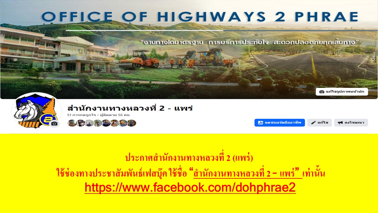 ประกาศสำนักงานทางหลวงที่ 2 (แพร่) ใช้ช่องทางประชาสัมพันธ์เฟสบุ๊ค ใช้ชื่อ “สำนักงานทางหลวงที่ 2 – แพร่” เท่านั้น
