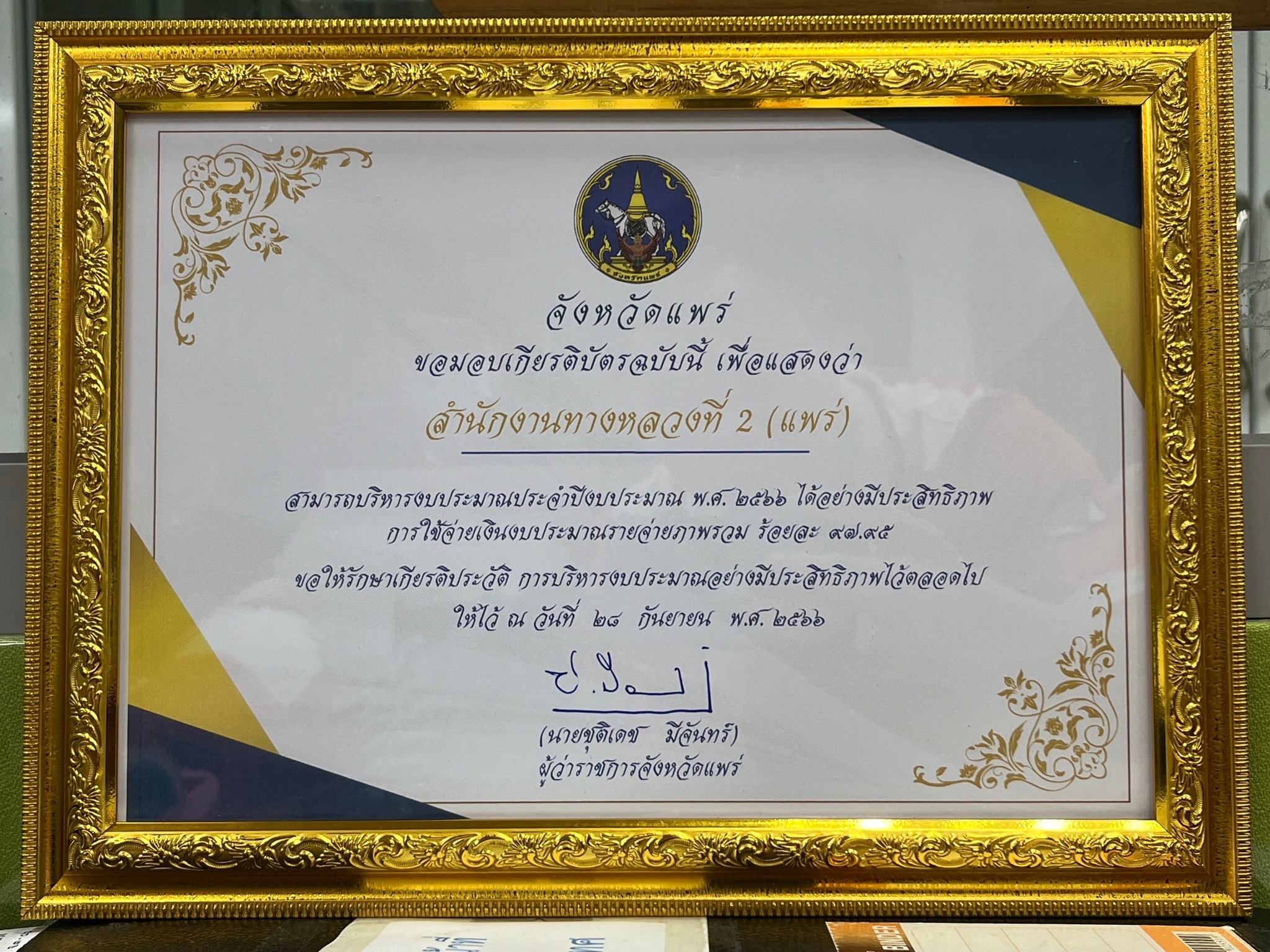นายชุติเดช มีจันทร์ ผู้ว่าราชการจังหวัดแพร่ มอบรางวัลและประกาศเกียรติคุณแก่บุคคลและหน่วยงานที่ได้รับรางวัล ซึ่ง สทล.2 (แพร่) ได้รับประกาศเกียรติคุณหน่วยงานขนาด XL (งบประมาณจัดสรร 100 ล้านบาทขึ้นไป)