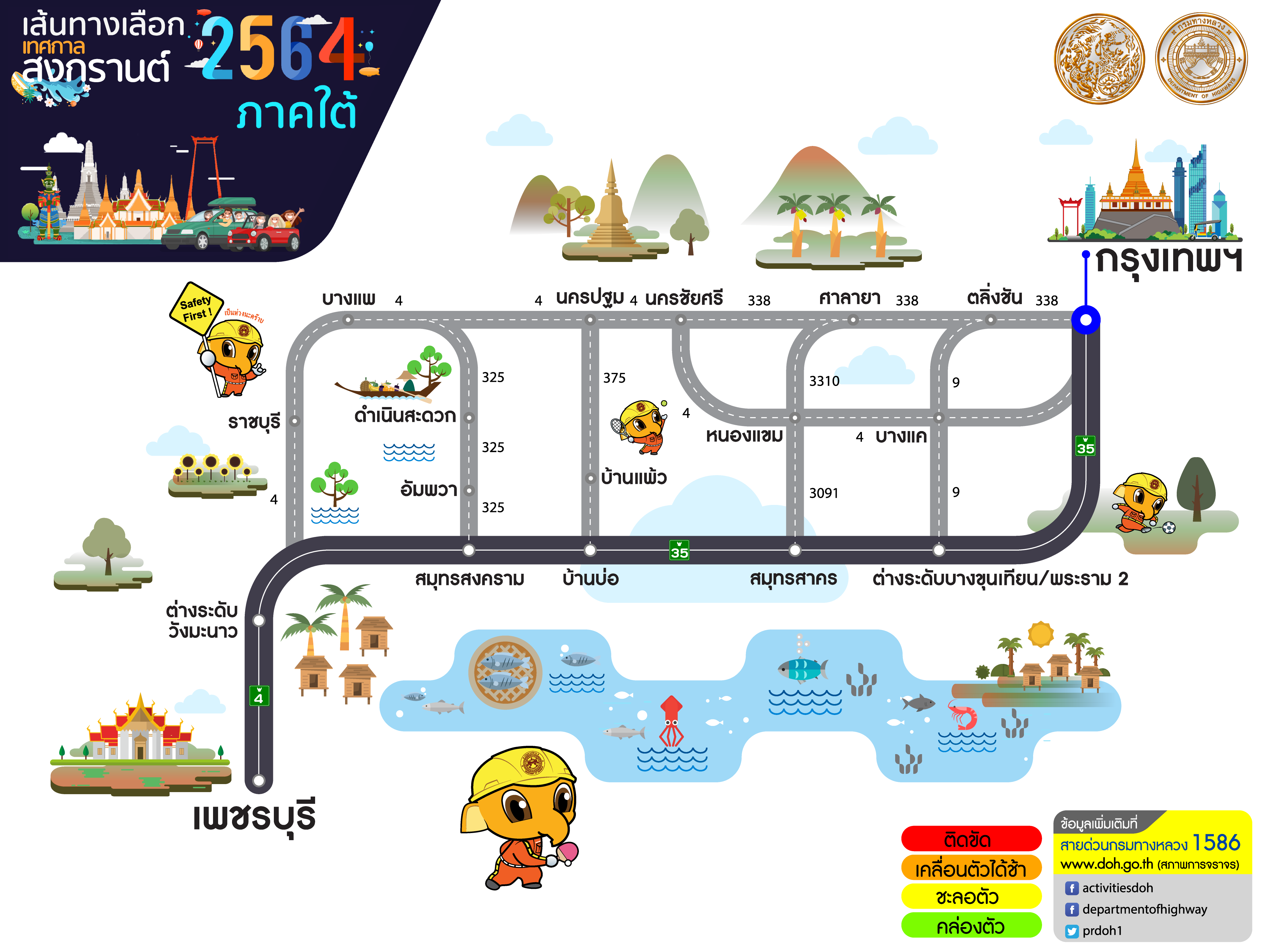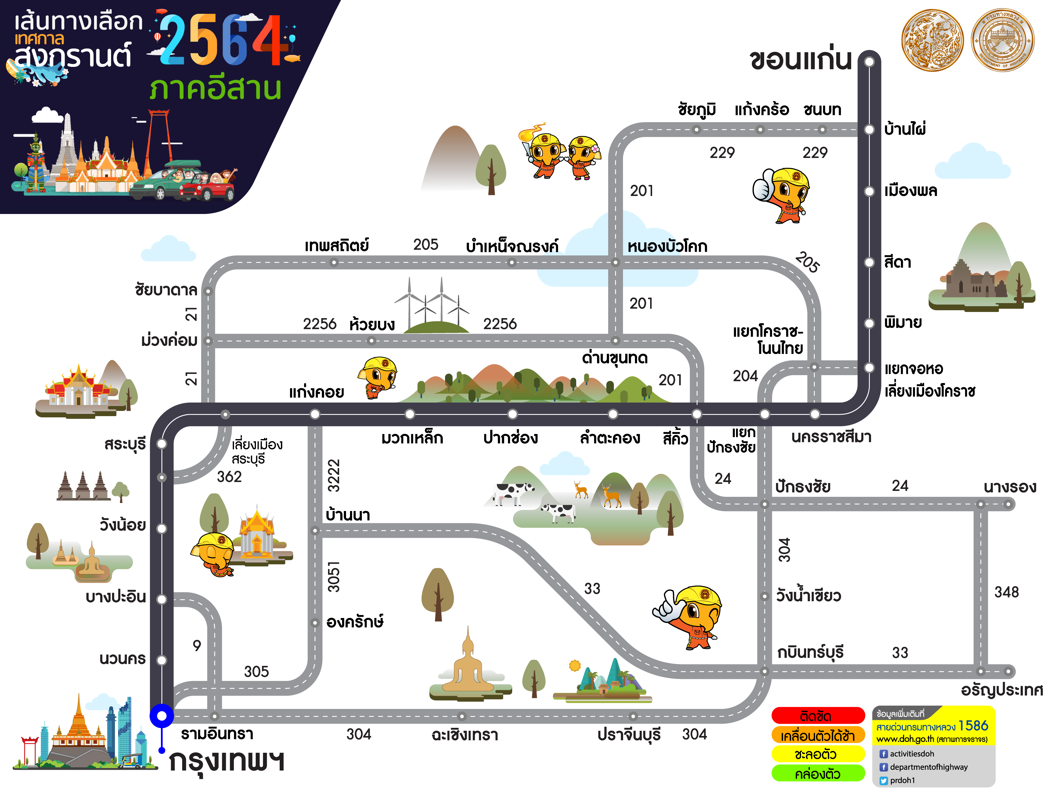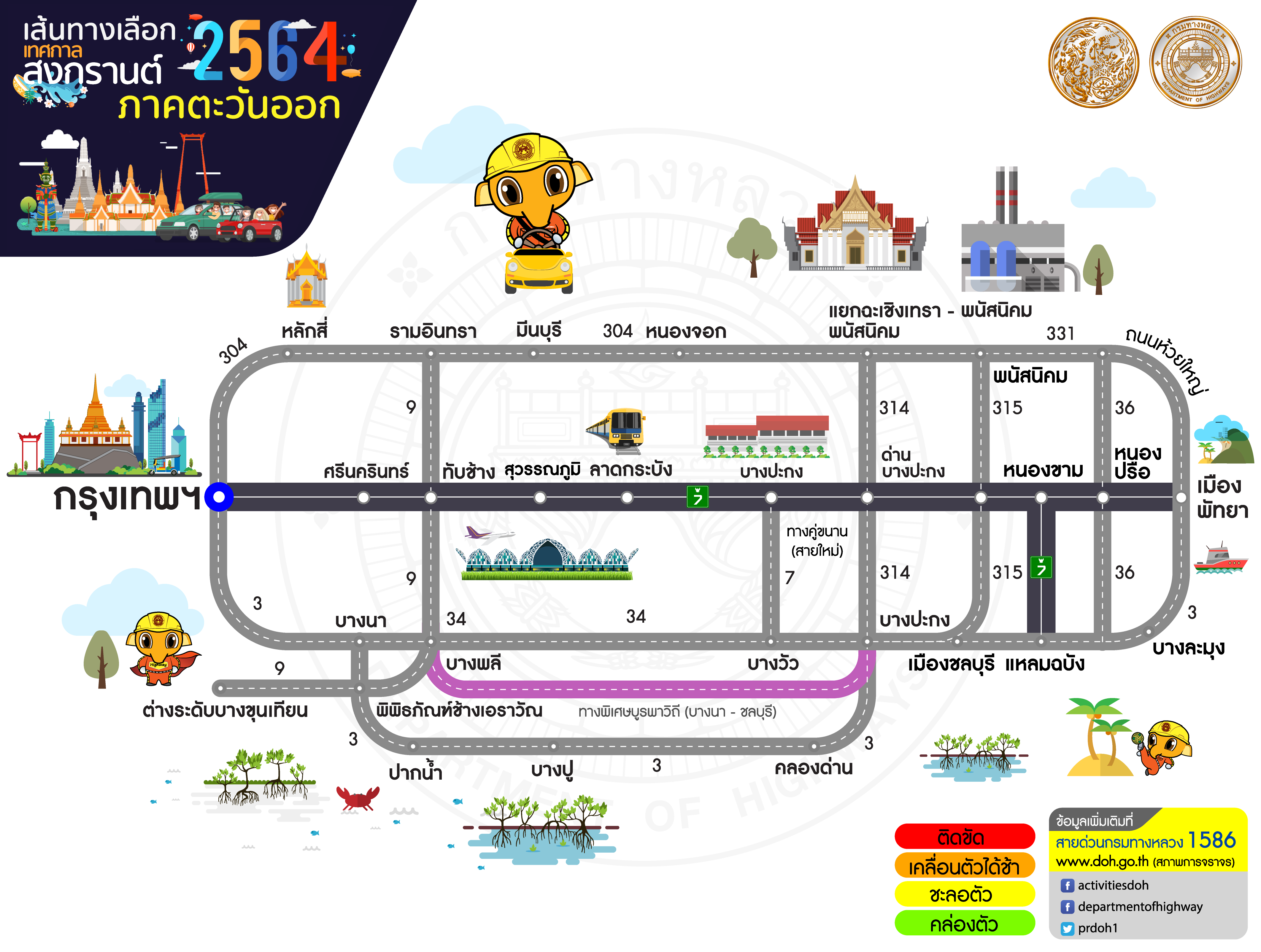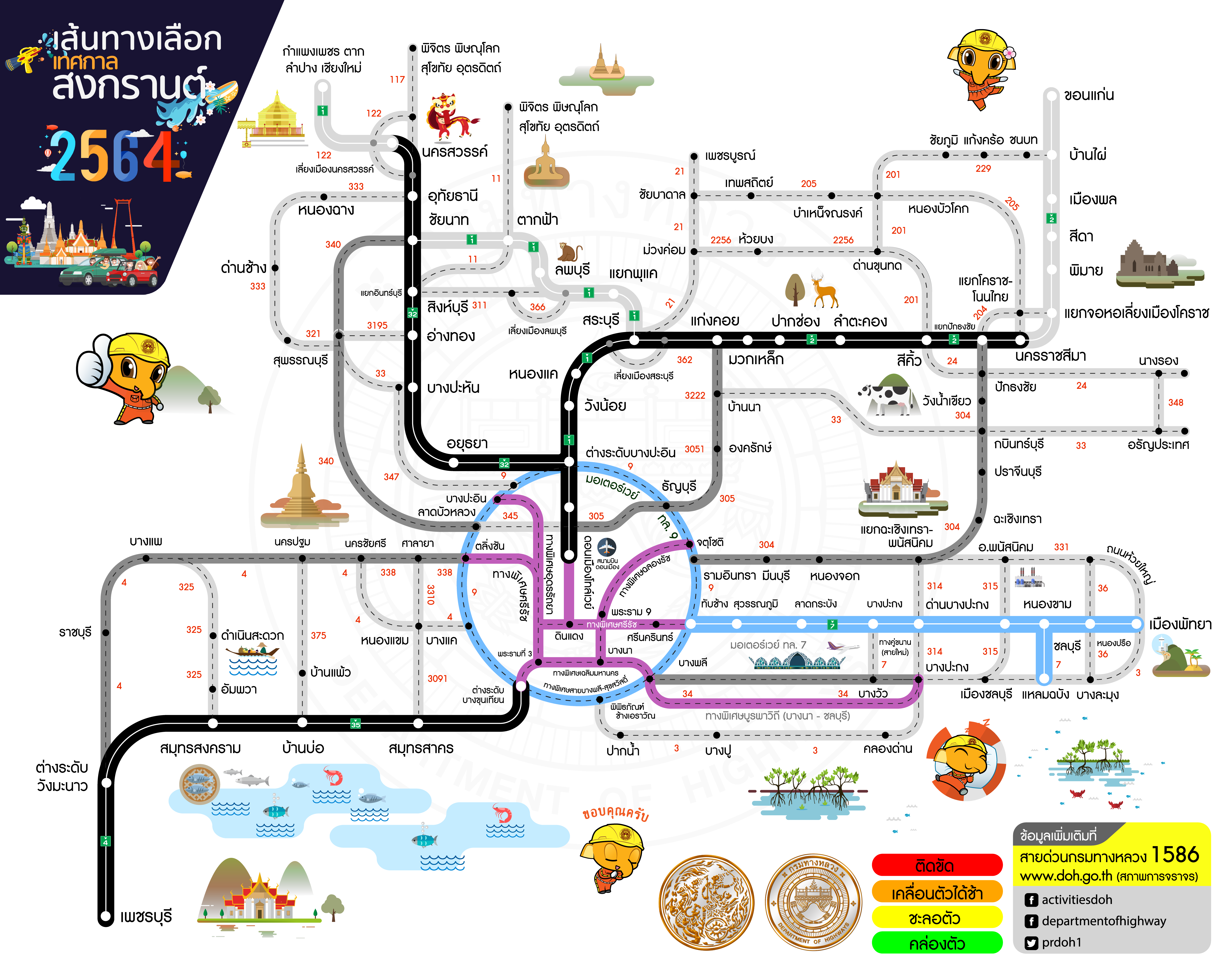 ทั้งนี้ หากประชาชนต้องการสอบถามข้อมูลการเดินทางเพิ่มเติมหรือแจ้งเหตุด่วนเหตุร้ายระหว่างเดินทาง สามารถติดต่อได้ที่สายด่วนกรมทางหลวง 1586 (โทรฟรีทุกเครือข่ายตลอด 24 ชั่วโมง) สายด่วนมอเตอร์เวย์ 1586 กด 7 และ ตำรวจทางหลวง 1193