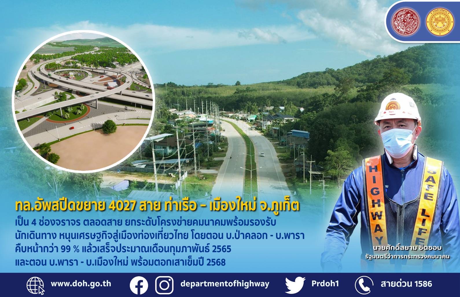 นายสราวุธ ทรงศิวิไล อธิบดีกรมทางหลวง เปิดเผยว่า นายศักดิ์สยาม ชิดชอบ รัฐมนตรีว่าการกระทรวงคมนาคม ได้ติดตามและเร่งรัดให้ดำเนินโครงการที่อยู่ระหว่างการก่อสร้างในพื้นที่จังหวัดภูเก็ตให้แล้วเสร็จทันตามกำหนด