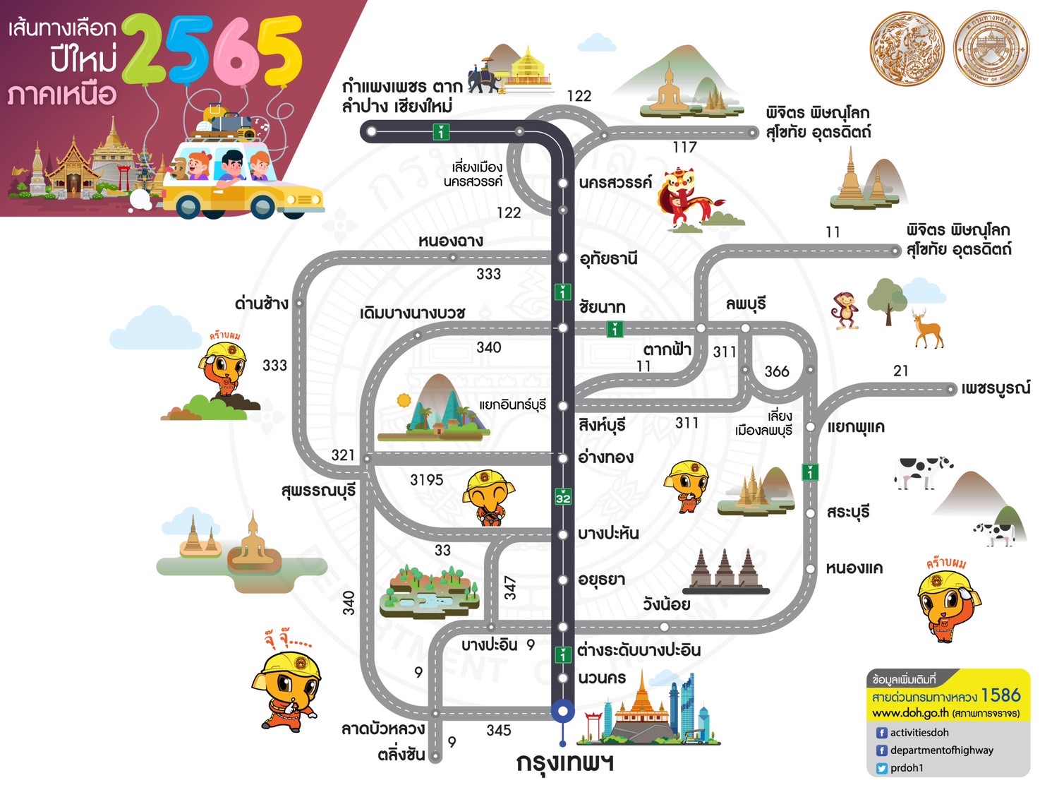 กรมทางหลวง แนะนำเส้นทางเลือกจากกรุงเทพฯสู่ภูมิภาคต่างๆ ช่วงเทศกาลปีใหม่ 2565 เพื่อให้ผู้ใช้ทางได้รับความสะดวกรวดเร็วในการเดินทาง สอบถามโทร 1586