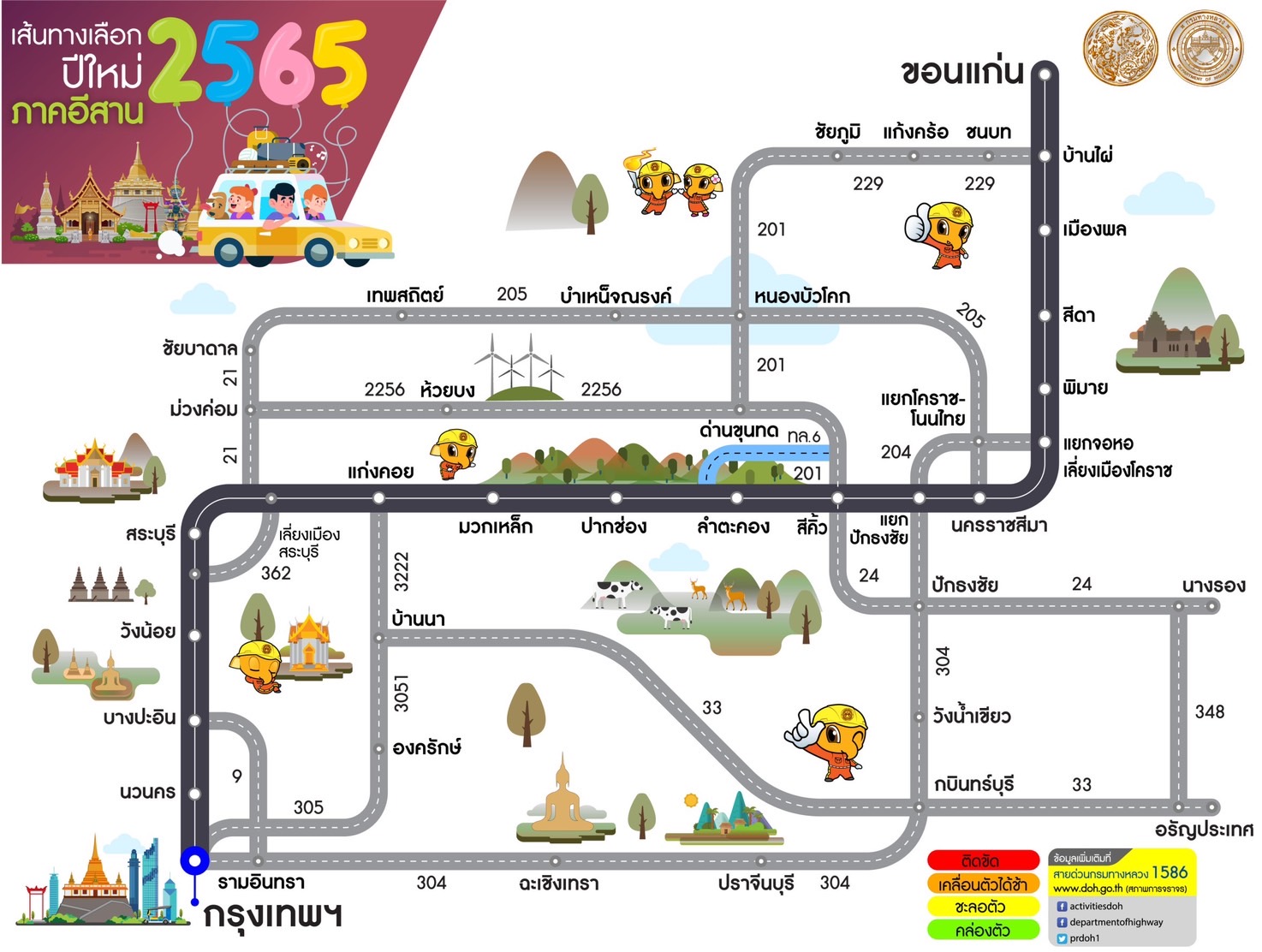 หากประชาชนต้องการสอบถามข้อมูลการเดินทางเพิ่มเติมหรือแจ้งเหตุด่วนเหตุร้ายระหว่างเดินทาง สามารถติดต่อได้ที่สายด่วนกรมทางหลวง 1586 (โทรฟรีทุกเครือข่ายตลอด 24 ชั่วโมง) สายด่วนมอเตอร์เวย์ 1586 กด 7 และตำรวจทางหลวง 1193