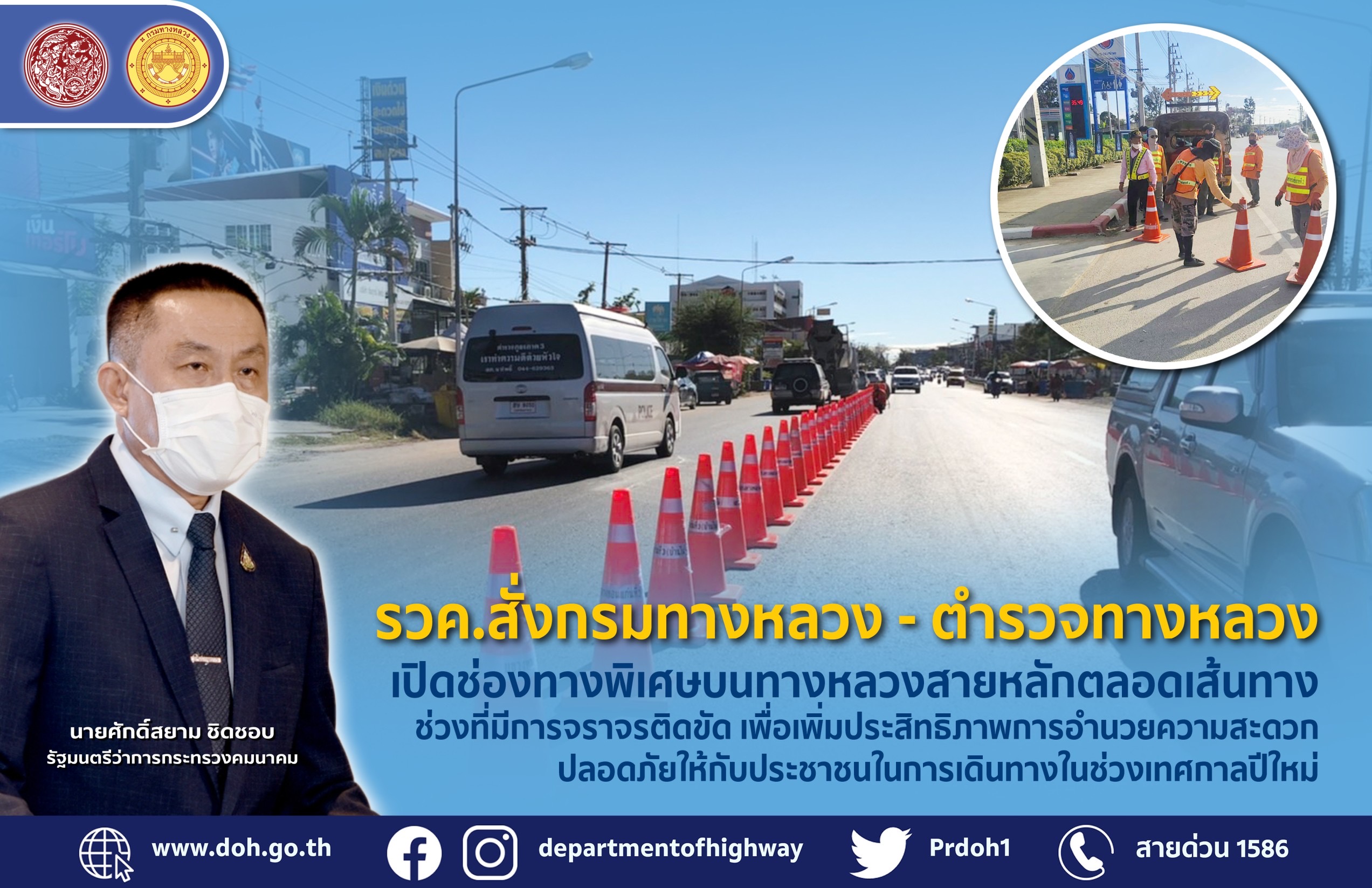 อย่างไรก็ตาม ขอความร่วมมือผู้ใช้ทางขับขี่ด้วยความระมัดระวังปฏิบัติตามกฎจราจร วางแผนการเดินทางล่วงหน้า เตรียมร่างกายให้พร้อม หากประชาชนต้องการสอบถามข้อมูลการเดินทางเพิ่มเติมหรือแจ้งเหตุด่วนเหตุร้ายระหว่างเดินทางสามารถติดต่อได้ที่สายด่วนกรมทางหลวง 1586 (โทรฟรีทุกเครือข่ายตลอด 24 ชั่วโมง) สายด่วนกรมทางหลวง 1586 มอเตอร์เวย์ 1586 กด 7 และตำรวจทางหลวง 1193