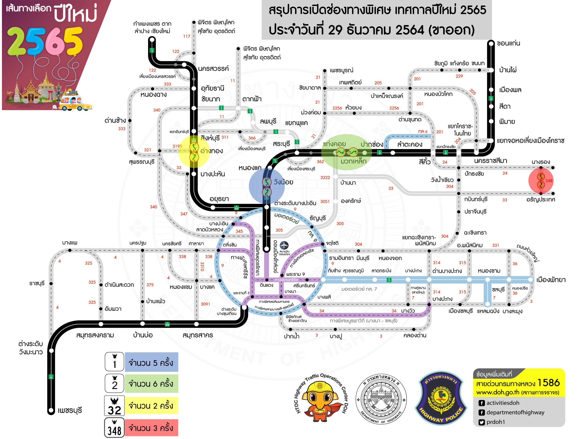 นายสราวุธ ทรงศิวิไล อธิบดีกรมทางหลวง เปิดเผยว่า ในช่วงเทศกาลปีใหม่ที่จะถึงนี้คาดว่าจะมีประชาชนเดินทางกลับภูมิลำเนาและท่องเที่ยวเป็นจำนวนมาก กรมทางหลวงจึงได้เตรียมความพร้อมในการอำนวยความสะดวกและปลอดภัยในระหว่างวันที่ 29 ธันวาคม 2564 – 4 มกราคม 2565 เพื่อรองรับการเดินทางของประชาชนสู่ภูมิภาคต่างๆ ซึ่งเป็นไปตามข้อสั่งการของนายศักดิ์สยาม ชิดชอบ รัฐมนตรีว่าการกระทรวงคมนาคม โดยได้สั่งการให้กรมทางหลวงประสานงานกับตำรวจทางหลวงดำเนินการเปิดช่องทางพิเศษ (Reversible Lane) บนทางหลวงสายหลัก ตลอดเส้นทางช่วงที่มีการจราจรติดขัด รวมทั้งบริหารจัดการปิดจุดแยกและปิดจุดกลับรถเพื่อลดกระแสการชะลอรถบริเวณทางร่วมทางแยกในทางหลวงสายหลัก ดังนี้