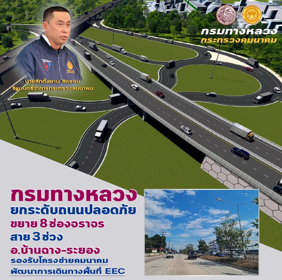 นายสราวุธ ทรงศิวิไล อธิบดีกรมทางหลวง เปิดเผยว่า นายศักดิ์สยาม ชิดชอบ รัฐมนตรีว่าการกระทรวงคมนาคม ได้เร่งรัดติดตามแผนงานการพัฒนาโครงข่ายทางหลวงและมาตรฐานความปลอดภัยในเส้นทาง พร้อมให้เร่งดำเนินโครงการก่อสร้างทางหลวงหมายเลข 3 (ถนนสุขุมวิท) ช่วง อ.บ้านฉาง-ระยอง โดยให้ขยายเป็น 8 ช่องจราจร ตามที่ได้มอบนโยบายไว้ เนื่องจากปัจจุบันทางหลวงสายดังกล่าวเป็นเส้นทางสายหลักสู่ภาคตะวันออกเชื่อมต่อไปยังสถานที่สำคัญต่างๆ เพื่อรองรับการขยายตัวของเศรษฐกิจและสอดคล้องต่อการพัฒนาทางหลวงรองรับโครงการระเบียงเศรษฐกิจภาคตะวันออก หรืออีอีซี ในส่วนของท่าเรือมาบตาพุดและสนามบินอู่ตะเภา และยังมีโครงการทางหลวงพิเศษหมายเลข 7 สาย พัทยา-มาบตาพุด จึงมีปริมาณการจราจรเพิ่มขึ้นและเกิดปัญหาการติดขัดของการจราจรโดยเฉพาะในชั่วโมงเร่งด่วน สภาพสองข้างทางเป็นพื้นที่ชุมชน ดังนั้นเพื่อลดการจราจรติดขัด นายศักดิ์สยาม ชิดชอบ รัฐมนตรีว่าการกระทรวงคมนาคมจึงได้เร่งรัดโครงการดังกล่าวเพื่อแก้ไขปัญหาการจราจรให้มีประสิทธิภาพและยั่งยืน ยกระดับถนนปลอดภัยในพื้นที่เขตพัฒนาพิเศษภาคตะวันออก (EEC) ตามนโยบายของรัฐบาล
