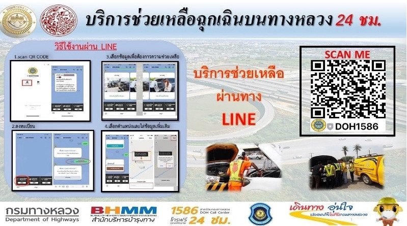 นอกจากนั้นกรมทางหลวงยังมีช่องทางการให้บริการช่วยเหลือฉุกเฉินบนทางหลวงตลอด 24 ชั่วโมง ผ่านทางแอปพลิเคชั่น LINE เพียงสแกน QR code หรือ เพิ่มเพื่อน DOH1586 ทำการลงทะเบียนแล้วเลือกข้อมูลเพื่อต้องการความช่วยเหลือ เลือกตำแหน่งและใส่ข้อมูลเพิ่มเติม ทั้งนี้ ผู้ใช้เส้นทางสามารถดาวน์โหลดแอปพลิเคชัน ทั้งระบบ IOS และ Android ได้ที่ App Store และ Google Play Store หากต้องการสอบถามรายละเอียดเพิ่มเติมได้ที่สายด่วนกรมทางหลวง 1586 (โทรฟรีทุกเครือข่ายตลอด 24 ชั่วโมง)