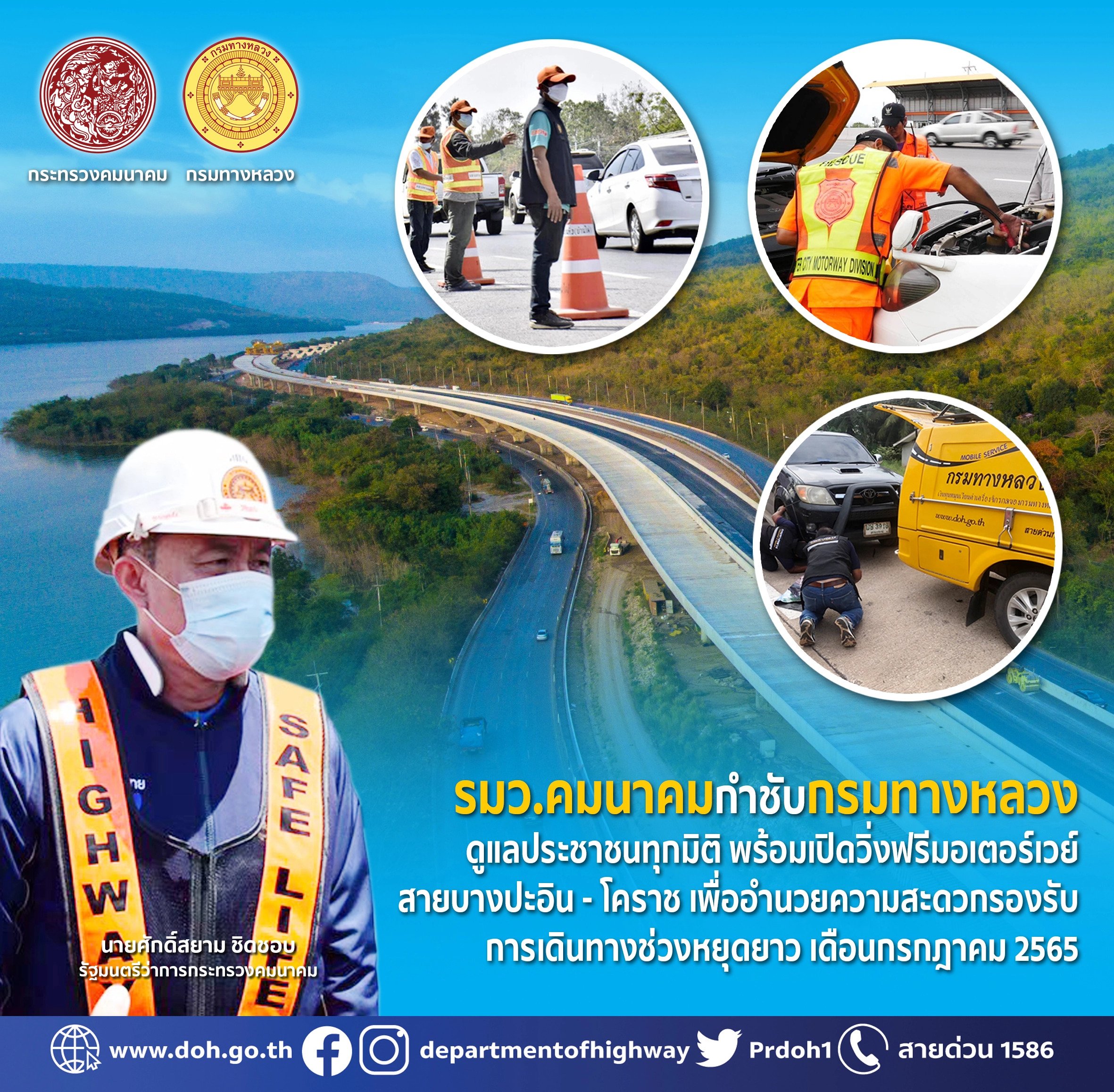 นายสราวุธ ทรงศิวิไล อธิบดีกรมทางหลวง เปิดเผยว่า นายศักดิ์สยาม ชิดชอบ รัฐมนตรีว่าการกระทรวงคมนาคม มีข้อสั่งการให้หน่วยงานในสังกัดเตรียมความพร้อมเพื่ออำนวยความสะดวกและความปลอดภัยรองรับการเดินทางของประชาชนในช่วงวันหยุดยาวเดือนกรกฎาคม 2565 ในวันอาสาฬหบูชาและวันเข้าพรรษาระหว่างวันที่ 13 – 17 กรกฎาคม 2565 และวันเฉลิมพระชนมพรรษาฯ ระหว่างวันที่ 28 – 31 กรกฎาคม 2565 พร้อมกำชับให้ดูแลประชาชนในทุกมิติ เน้นการบริหารการจราจรในพื้นที่ที่มีการก่อสร้างฯ ไม่ให้สภาพการจราจรติดขัด เพื่อให้เกิดความสะดวก รวดเร็ว ปลอดภัยขั้นสูงสุด ลดการสูญเสียทั้งชีวิตและทรัพย์สิน และห่างไกล COVID – 19 พร้อมมอบให้กรมทางหลวงเปิดให้บริการวิ่งฟรีชั่วคราวบนทางหลวงพิเศษระหว่างเมืองหมายเลข 6 (M6) สายบางปะอิน – นครราชสีมาช่วงปากช่อง - สีคิ้ว -ขามทะเลสอ ระยะทาง 64 กิโลเมตร ในช่วงวันอาสาฬหบูชาและวันเข้าพรรษา ขาออกวันที่ 13 – 14 กรกฎาคม 2565 และขาเข้าวันที่ 15 – 17 กรกฎาคม 2565 และช่วงวันเฉลิมพระชนมพรรษาฯ ขาออก วันที่ 28 – 29 กรกฎาคม 2565 และขาเข้าวันที่ 30 – 31 กรกฎาคม 2565 เพื่อแบ่งเบาการจราจรบนทางหลวงหมายเลข 2 (ถนนมิตรภาพ)