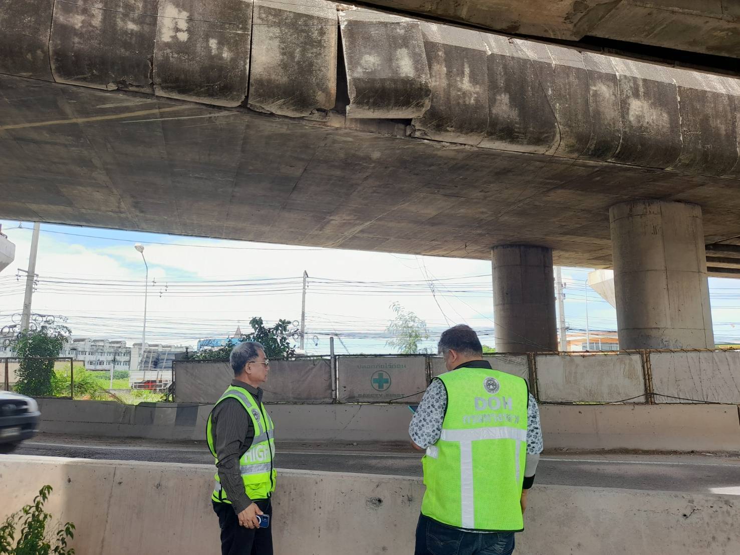 กรมทางหลวง โดย สำนักงานทางหลวงที่ 13 (กรุงเทพ) และแขวงทางหลวงสมุทรสาคร ได้ร่วมลงพื้นที่ทำการตรวจสอบทันที พบว่า เป็นสะพาน Over Pass (มหาชัยเมืองใหม่) ทางหลวงหมายเลข 3242 (ถนนเอกชัย) ที่ กม.7+000 ด้านขวาทาง ตัดกับทางหลวงหมายเลข 35 (ถนนพระราม 2) ที่ กม.21+400 อยู่ในพื้นที่ตำบลคอกกระบือ อำเภอเมือง จังหวัดสมุทรสาคร โดยได้ตรวจพบแผงกั้นคอนกรีต (Fin) ของสะพานฉีกออกจากแนวยาวประมาณ 50 ซม. และคอนกรีตแตกร้าว จำนวน 5 แผ่น ซึ่งสาเหตุการชำรุดเกิดจากอุบัติเหตุรถบรรทุกซึ่งมีความสูงเกินกำหนด ฝ่าฝืนป้ายห้ามกำหนดความสูง (5.00 ม.) เฉี่ยวชนจนเกิดความเสียหายดังกล่าว