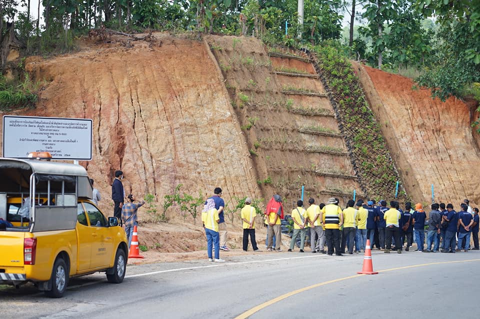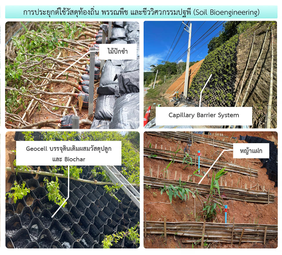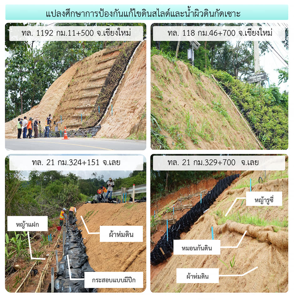สำหรับการศึกษาโครงการดังกล่าว ได้ดำเนินการในพื้นที่นำร่องไปแล้วทั้งหมด 4 จุด ได้แก่ 1) ทล. 1192 กม.11+500 จ.เชียงใหม่ 2) ทล. 118 กม.46+700 จ.เชียงใหม่ 3) ทล. 21 กม.324+151 จ.เลย และ 4) ทล. 21 กม.329+700 จ.เลย พบว่า มีจุดเด่นที่เป็นประโยชน์หลายด้าน ทั้งการประยุกต์ใช้พรรณพืชตามหลักชีววิศวกรรม (Bio-engineering) การนำวัสดุท้องถิ่น (Local) และวัสดุหมุนเวียน (Recycled) กลับมาใช้ใหม่ การบริหารจัดการน้ำผิวดินและน้ำใต้ดินอย่างเป็นระบบและมีประสิทธิภาพ การสาธิตการทำงานของเทคโนโลยีตรวจวัด ติดตาม รายงาน และประเมินความปลอดภัยทางด้านวิศวกรรมด้วยระบบอุปกรณ์ตรวจวัดในสนามที่เชื่อมต่อกับแพลทฟอร์มอินเทอร์เน็ต (IoT Platform) ซึ่งทำหน้าที่รายงานข้อมูล พยากรณ์ เตือนภัย ประเมินความปลอดภัย ความเสี่ยงต่างๆ และติดตามเฝ้าระวังภัยพิบัติดินสไลด์แบบ Real Time ผ่าน Web Application